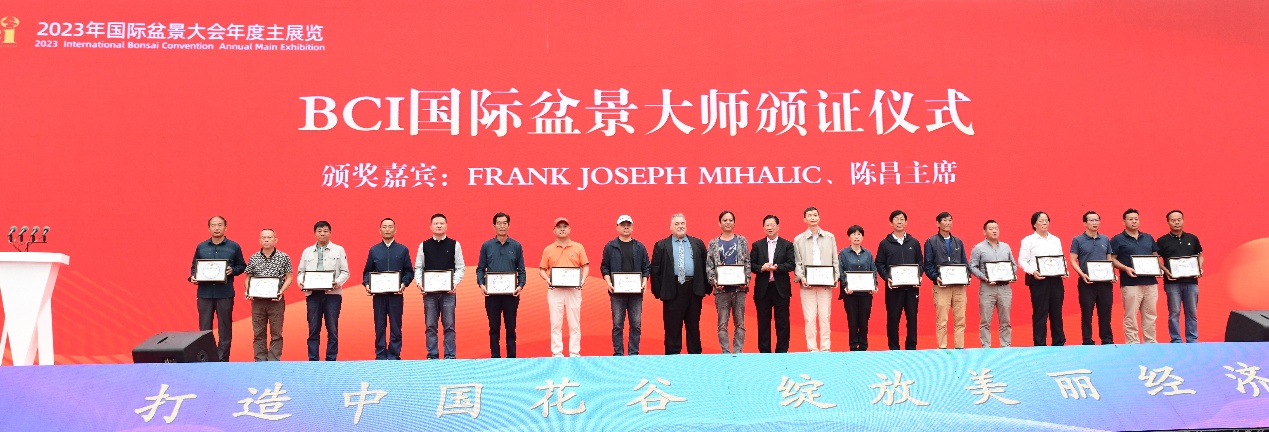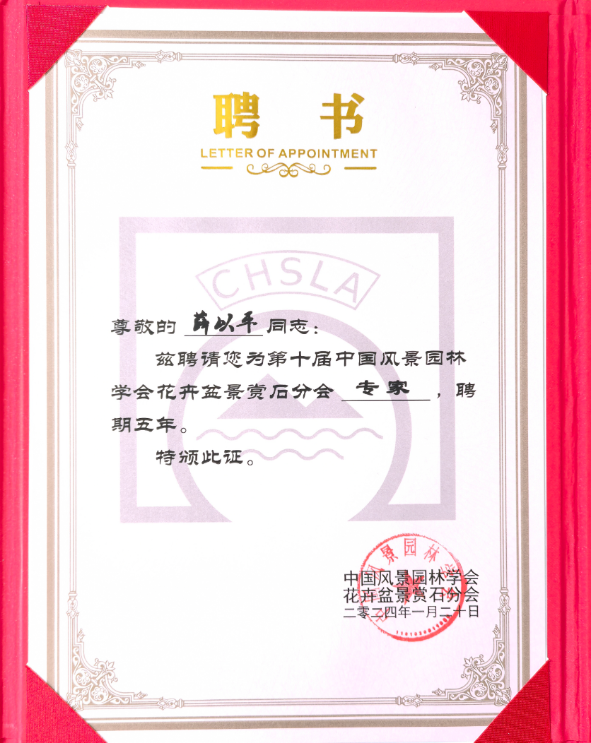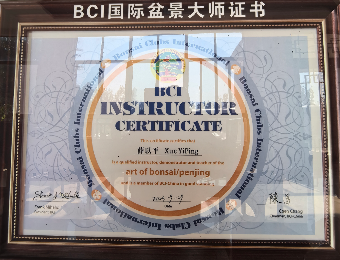 2023年,他以全国第一名成绩(综合评比考核)被国际盆景协会(BCI)授予国际大师荣誉称号,2024年被中国风景园林学会花卉盆景赏石分会聘为专家组成员。