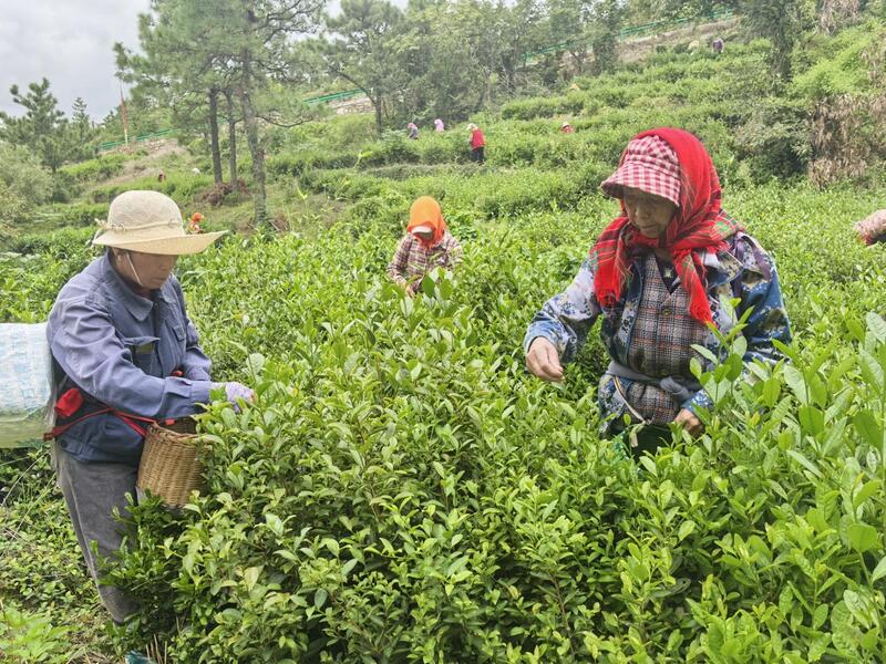 “秋分是采摘秋茶的最佳时节。”孔雀湖茶场现场负责人乔乃明指着前方在云雾中若隐若现的垄垄茶田介绍说,“近期,我们每天都组织工人前来抢摘鲜叶,以单芽和一芽一叶为主要标准,严格控制采摘、制作标准,力求提升茶叶品质。”
