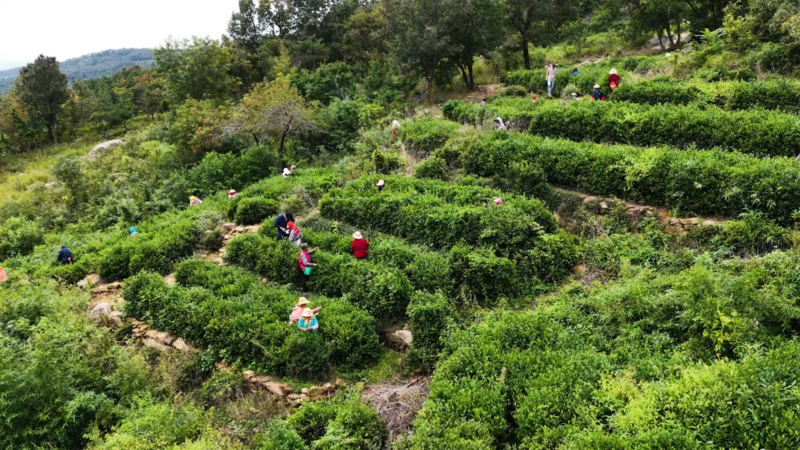 昨天上午,南云台林场孔雀湖茶场团瓢茶园呈现了一派繁忙的景象:田垄中,一颗颗茶树排列整齐,在前几日一场秋雨的滋润下显得愈发茁壮,走近细看,叶片上还带着清晨未消散的露珠,显得格外清新可爱。