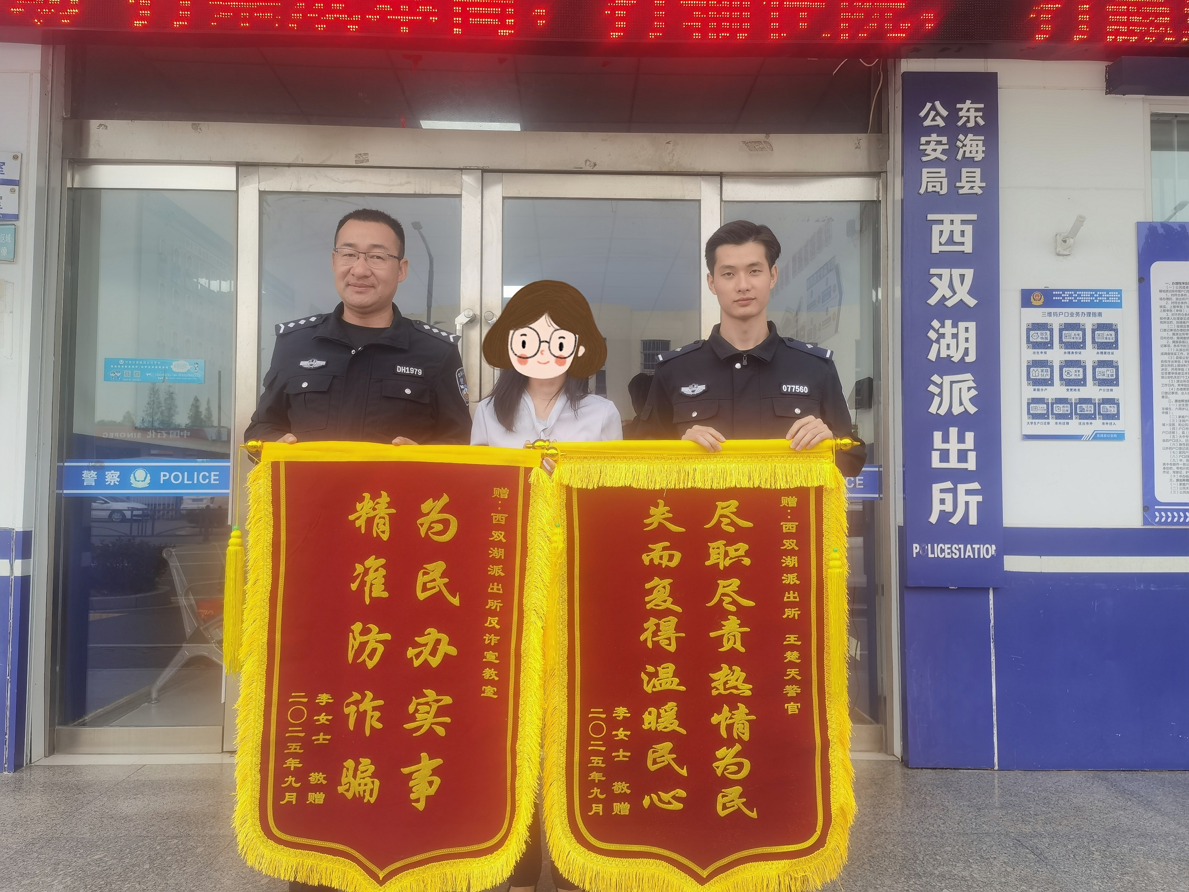 中国江苏网9月25日连云港讯 9月22日一大早,东海县牛山街道居民李女士专程来到东海县公安局西双湖派出所,将两面分别印有“为民办实事,精准防诈骗”和“尽职尽责热情为民,失而复得温暖民心”的锦旗送到办案民警王楚天与反诈劝阻员霍永超手中,对警方高效行动,为其全额追回30余万元被骗资金表示衷心感谢。