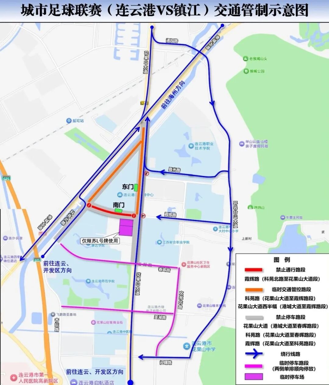 2025江苏省城市足球联赛(连云港VS镇江)比赛将于2025年9月27日19时35分在连云港市体育中心举行,为确保比赛期间道路安全、畅通、有序,给市民提供更好的交通出行环境,保证活动顺利举行,依据《中华人民共和国道路交通安全法》第三十九条之规定,对部分道路采取临时交通管控措施,现通告如下: