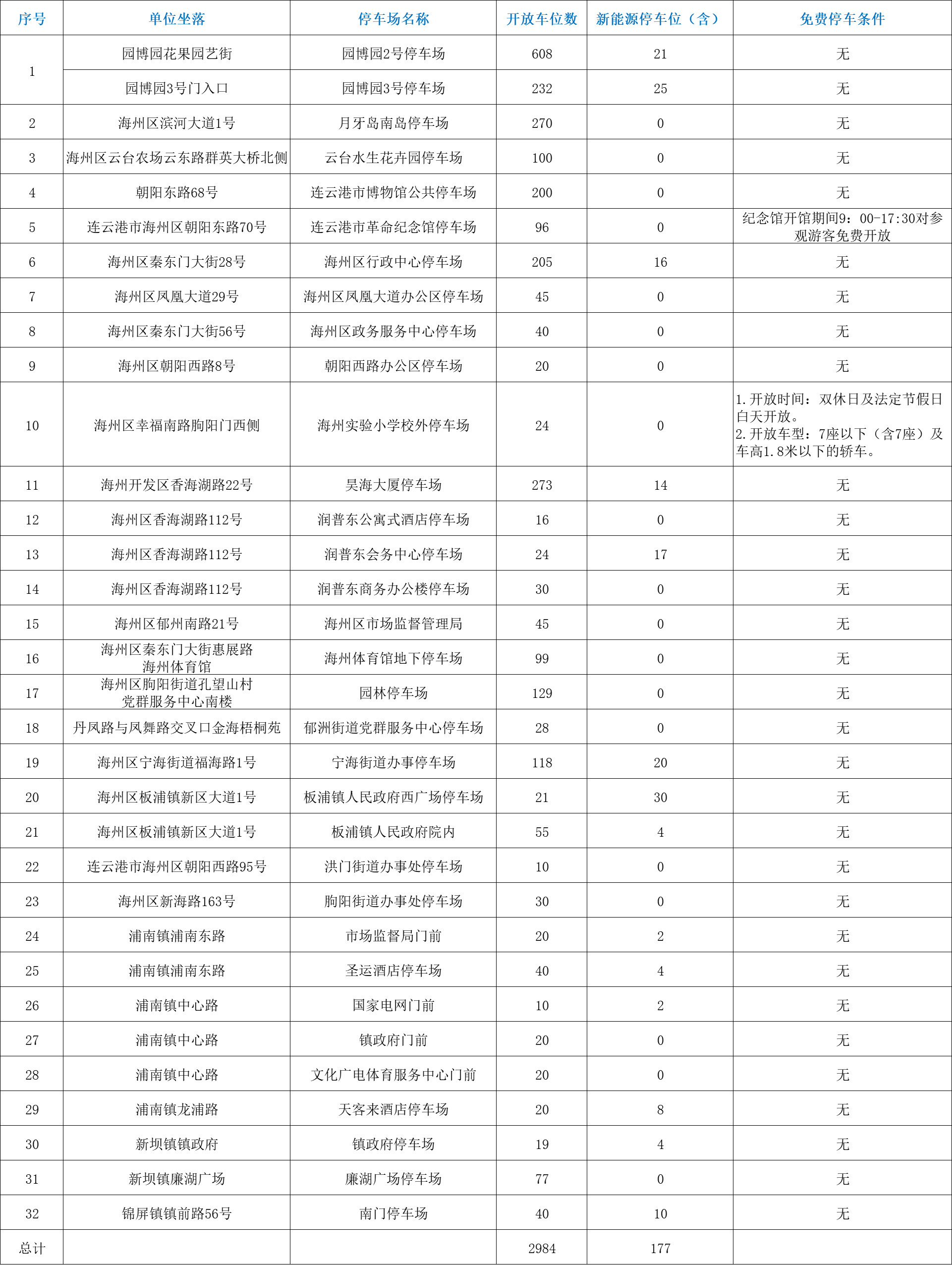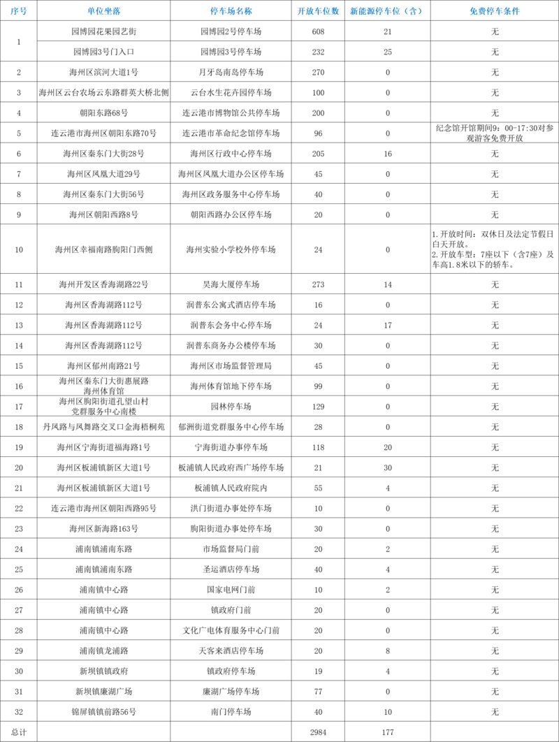 此次海州区免费开放的停车位,涵盖海州区党政机关企事业单位内部停车场及部分公共停车场,总计2984个泊位,其中包含177个新能源停车位,充分满足不同车辆需求。多数停车场无额外使用条件,游客可直接停放。部分停车场根据实际情况设置了合理限制,如海州实验小学校外停车场仅限7座以下(含7座)、车高1.8米以下的轿车驶入;连云港市革命纪念馆停车场则是在纪念馆开馆时段(9:00-17:30)对参观游客免费开放,兼顾便利与管理。