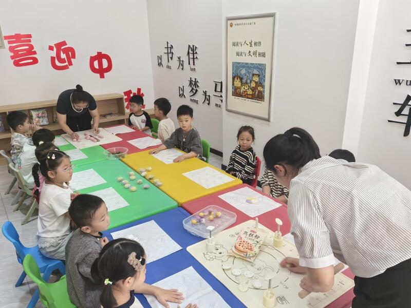 “八月十五月正圆,中秋月饼香又甜,月饼最初是祭月的供品,后来成为家人团聚的象征……”手工月饼制作活动香气四溢,大家在面点师傅的指导下,学着制作传统月饼。面团在手中揉捏,馅料精心包裹。“这是我做的月饼!”小朋友骄傲地展示着作品,“国庆节要记住革命先辈的奋斗,中秋节要珍惜团圆的美好。”稚嫩的话语道出了双节的深刻内涵。