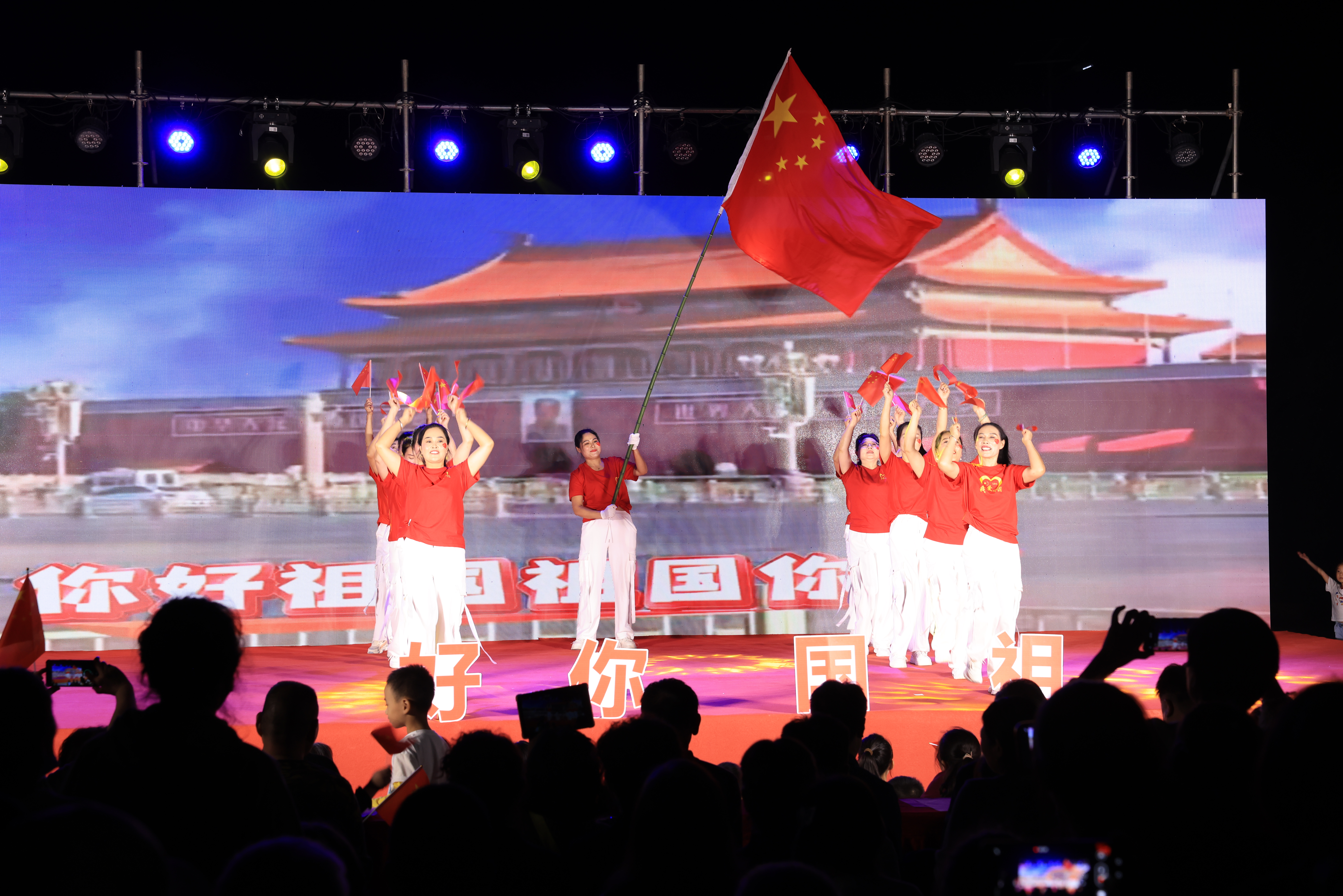演出伊始,开场舞《欢聚一堂》便以欢快的旋律、灵动的舞姿点燃全场热情,随后斗笠秀《云朵上的羌寨》、快板《国家安全比天大》、群舞《祖国你好》、独唱《边疆处处赛江南》等精彩节目轮番上演,让现场观众大饱眼福。演出中场的灯谜互动环节更是将气氛推向高潮,居民们踊跃举手猜谜,答对的人则捧着小礼品笑得开怀,现场氛围热烈。演出尾声,当《我的祖国》熟悉的旋律响起,观众便自发合唱,嘹亮的歌声穿透夜色,家国情怀在这一刻深深汇聚。