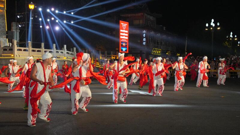 当日晚间,海州古城墙下,安塞腰鼓巡演迎来收官。近百名扎着头巾的陕北汉子踏地击鼓,红绸翻飞,鼓点如雷撞击古城肌理。鼓手跳跃、旋转、呐喊,古城墙化作沉默“历史观众”,鼓声回荡间模糊时空——分不清是当下庆典节奏,还是秦汉烽烟战鼓;是现代演员身影,还是古代凯旋战士。这场跨地域文化碰撞,为国庆假期添上浓墨重彩的一笔。