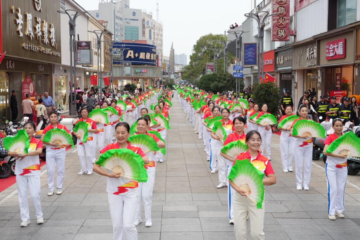 文化盛宴高潮当属千人快闪。《我和我的祖国》稚嫩童声突然响起,300名持小国旗的合唱队员从四方汇聚,身披星光高歌。周边群众纷纷加入,青年、老人、本地市民、外地游客齐挥国旗合唱。随后《我爱你中国》接力,秋夜微凉被歌声暖流驱散。同日下午,在火车站、陇海步行街500名广场舞队员与300余名模特以“舞蹈 + 走秀”快闪,演绎海州原创广场舞《美丽海州舞起来》,旋律藏烟火气、舞步显家乡风光,无舞台界限的全民狂欢,既致敬峥嵘岁月,更展现新时代海州的朝气与自信。
