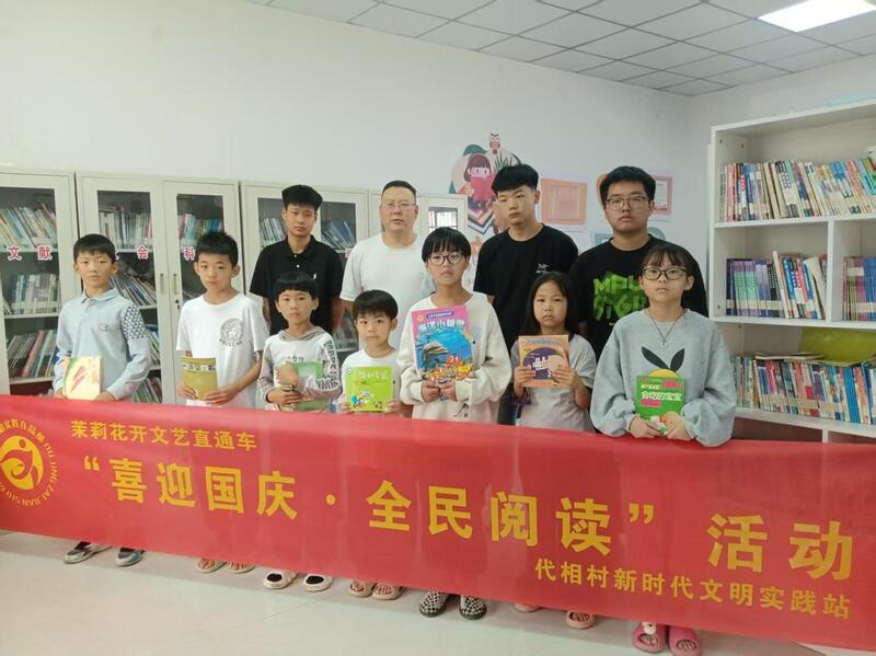 中国江苏网10月2日连云港讯 为丰富孩子们国庆中秋期间精神文化生活,厚植爱国情怀,10月1日,东海县双店镇新时代文明实践所、双店镇代相村新时代文明实践站联合举办茉莉花开文艺直通车“金秋十月颂华诞 书海徜徉庆国庆”主题读书活动,让“处处有书伴、时时闻书香”的氛围更加浓厚,为中华人民共和国成立76周年献礼。