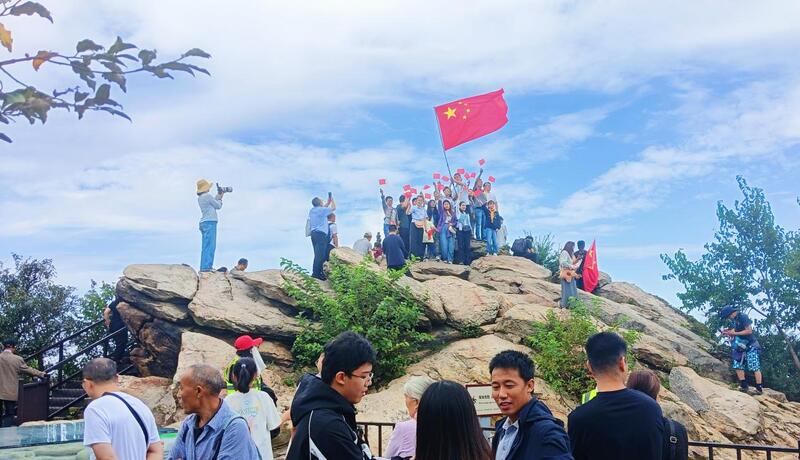 “国庆中秋”双节首日,花果山景区各类主题活动精彩上演。在玉女峰,游客们登顶江苏之巅,纷纷挥舞起手中的国旗。鲜艳的红色与灿烂的笑脸交织,歌声、欢呼声与秋韵共鸣,处处洋溢着欢乐祥和的节日氛围。在这喜庆的节日里,游客们极目远眺,群山延绵、秋色如画,欢声笑语在山谷间此起彼伏。