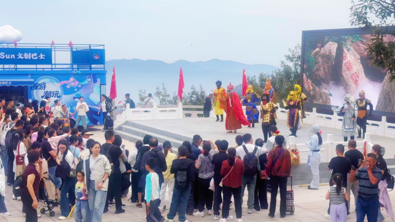 在水帘洞、玉女峰等主要景点,“西游演艺”为景区增添了更多趣味。孙悟空手持金箍棒在人群中灵活穿梭,不时与游客击掌互动;猪八戒憨态可掬地拉着小游客合影,引发阵阵欢笑……师徒四人情景剧表演引得里三层外三层的游客驻足观看,精彩的台词互动让现场掌声不断。游客们纷纷举起手机记录这些精彩瞬间,孩子们更是兴奋地追随着西游人物的脚步,仿佛置身于神话世界,沉浸式感受西游文化的独特魅力。