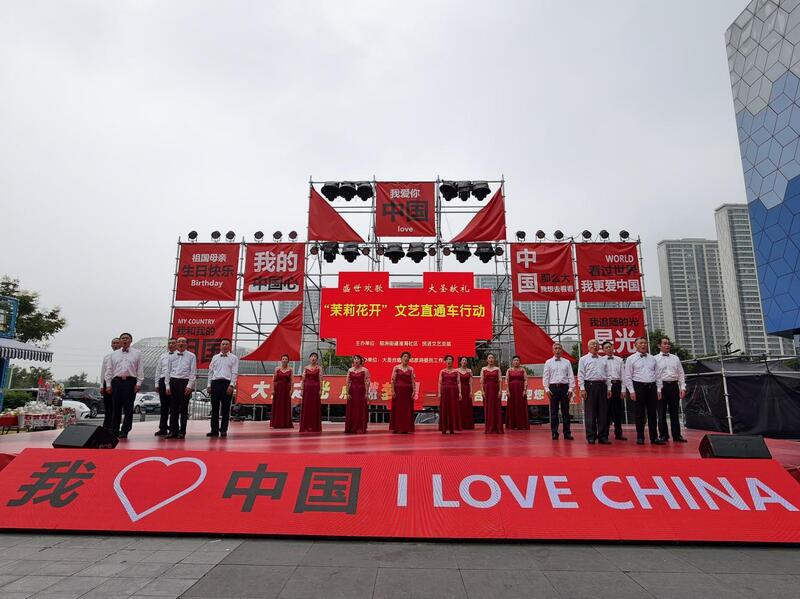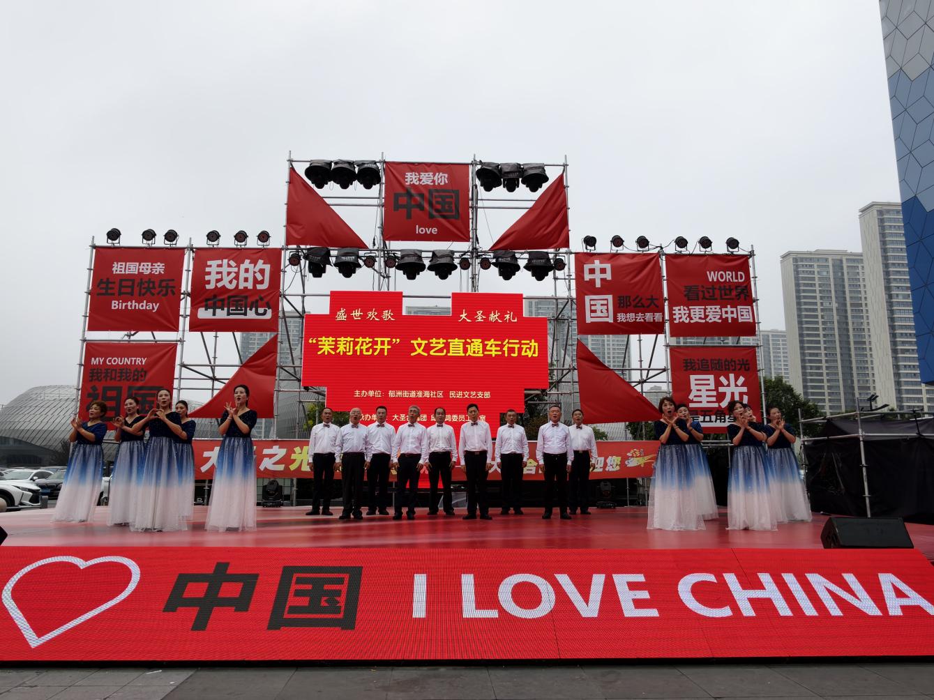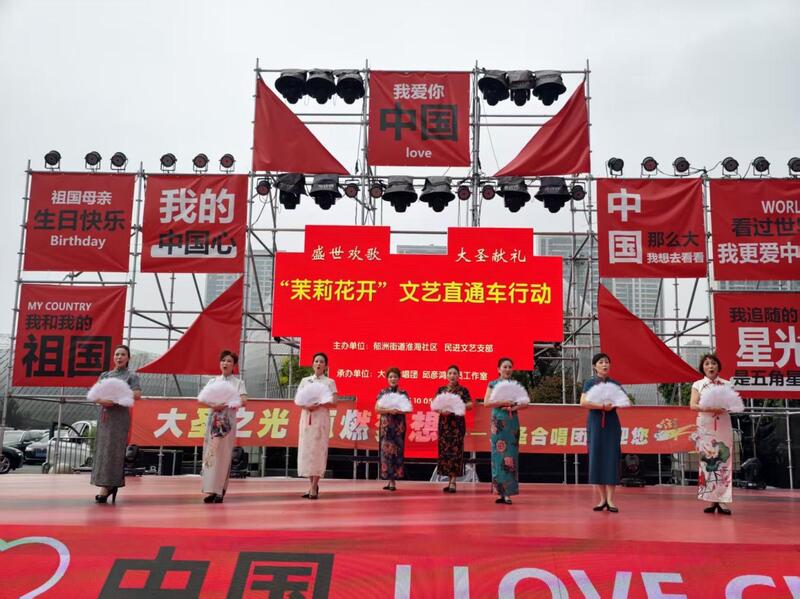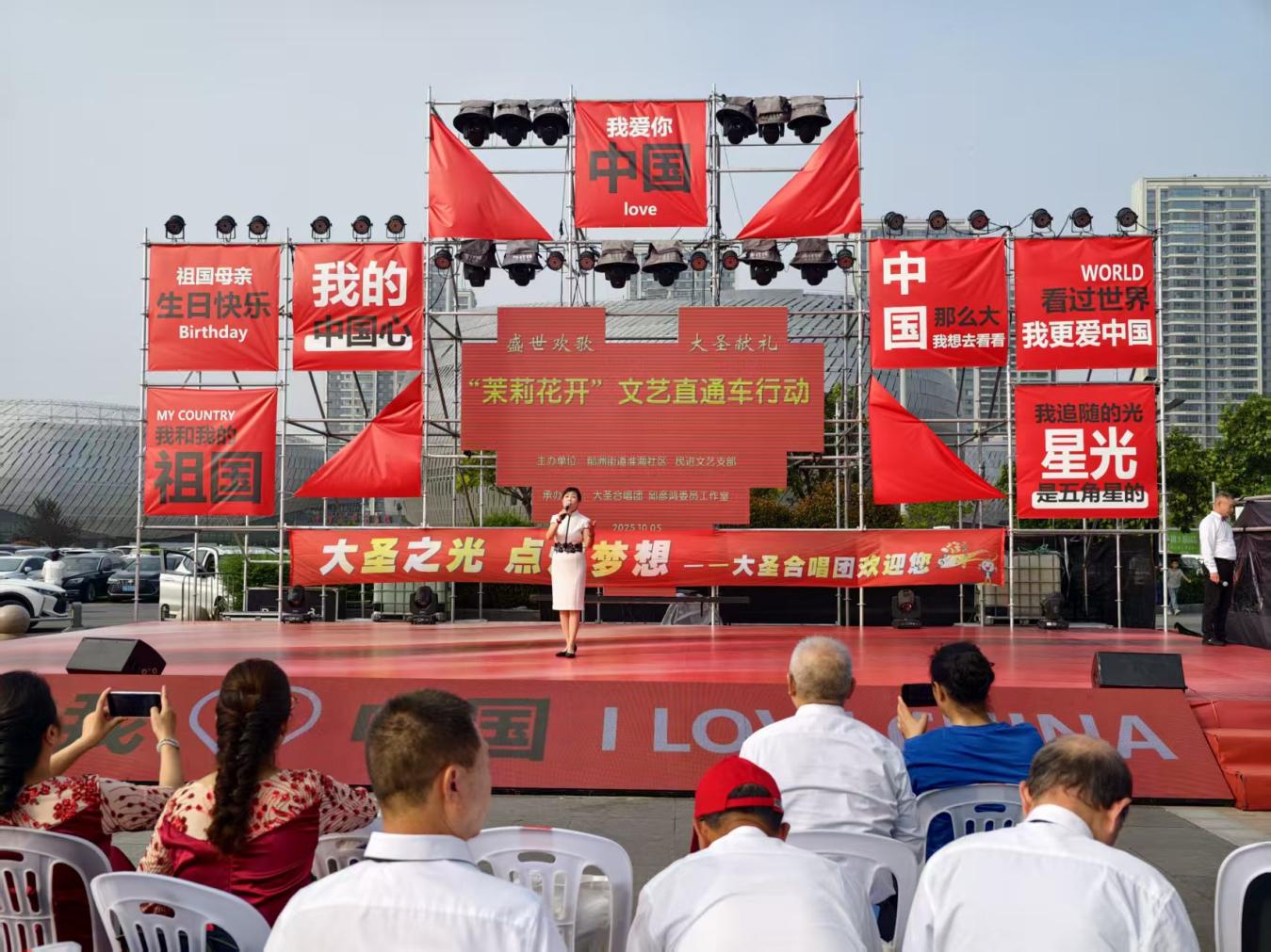 演出现场氛围浓厚,“我的中国心”“祖国母亲生日快乐”等标语鲜艳夺目,与舞台背景板上“盛世欢歌 大圣献礼”主题、“茉莉花开”文艺直通车行动字样交相辉映,鲜明传递出活动弘扬主旋律、凝聚奋进力量和“强国复兴有我”的导向。