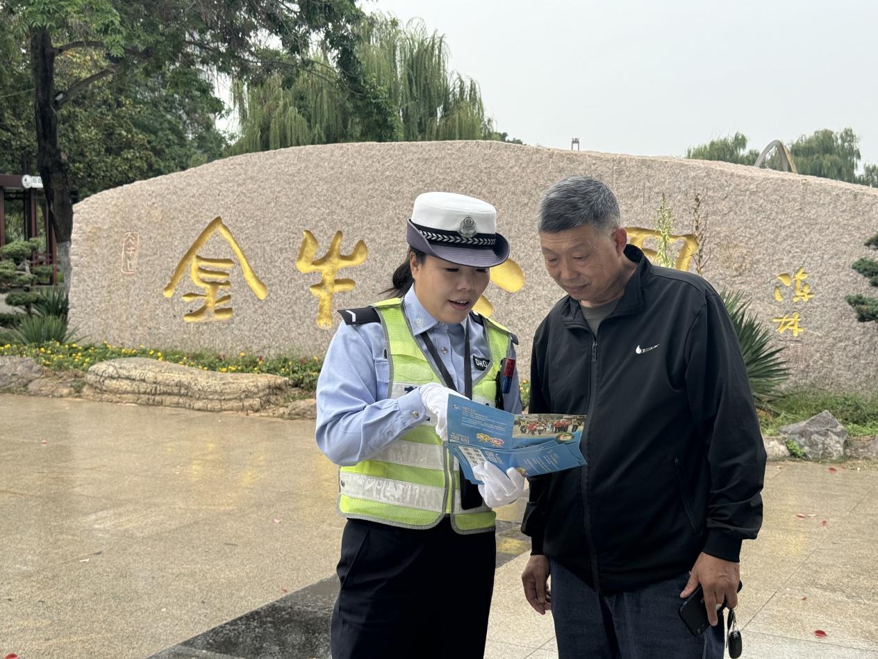在热闹非凡的金牛公园,民警通过摆放宣传展板、面对面讲解等方式,吸引了大量群众驻足观看。民警用通俗易懂的语言,向“一老一小”群体普及如何安全过马路、如何识别交通信号等基本常识,呼吁广大家庭共同关注交通安全,培养良好的出行习惯。
