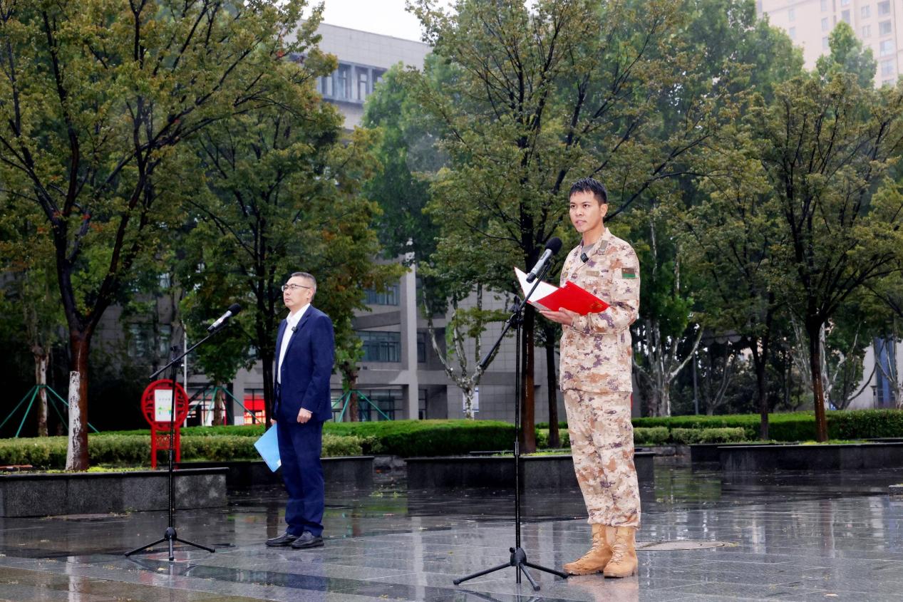 中国江苏网10月15日连云港讯 10月13日清晨,细雨蒙蒙,连云港职业技术学院在图书馆南广场举行“祖国永远在我心中”主题升旗仪式。学校特别邀请到今年九三阅兵预备役部队方队成员、本校2025届毕业生郑慧升同学,分享自己作为退役军人的奋斗故事,让这份家国情怀化作一堂生动的实践教育课。