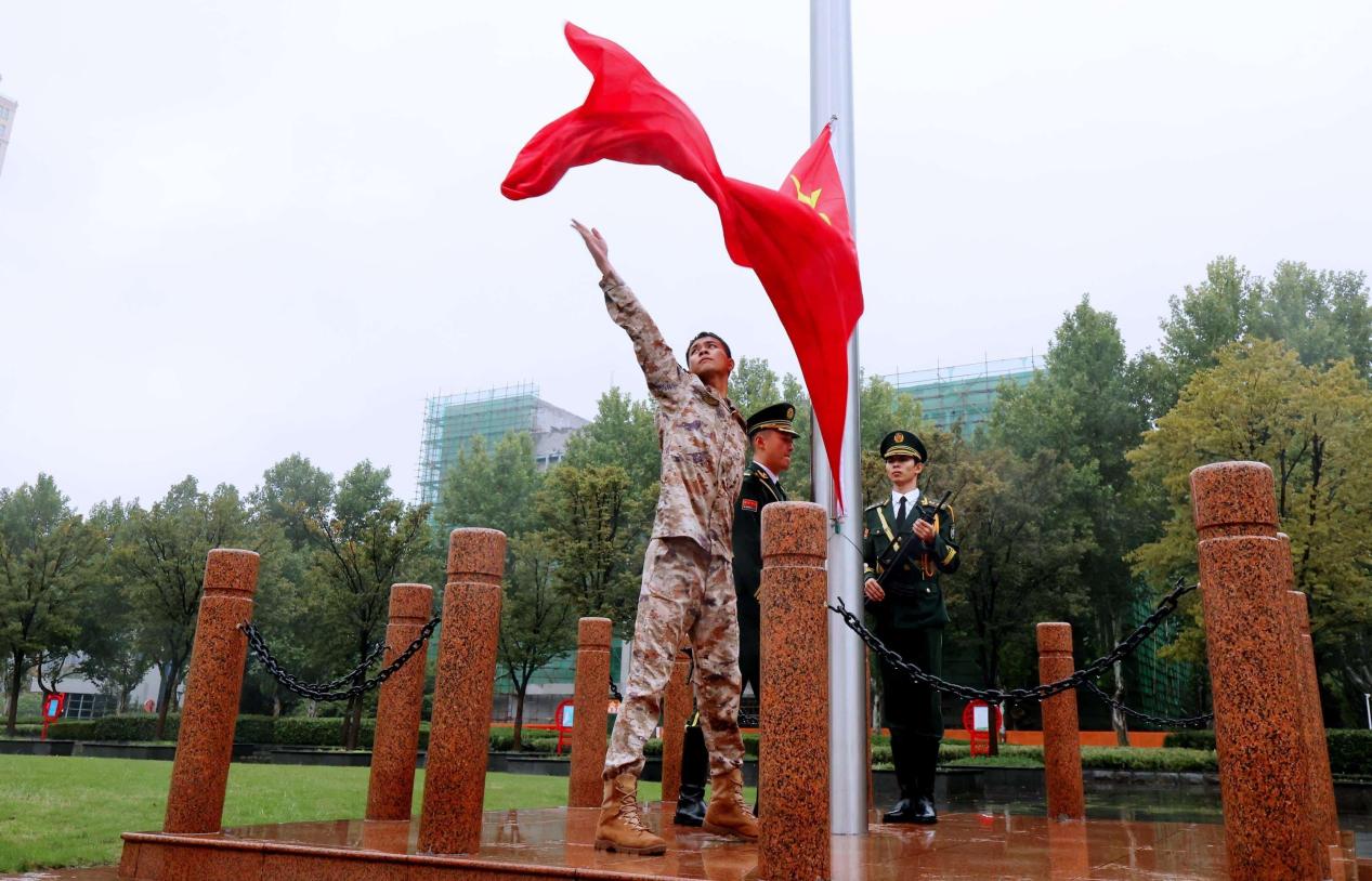 上午7点30分,升旗仪式正式开始。郑慧升作为国旗护卫队前队长,带领队员以每步75厘米的精准距离,迈着铿锵有力的步伐走向国旗台。动作整齐划一、英姿飒爽,每一步都饱含着退伍军人们的坚毅与荣光,彰显着军人过硬的素质与本领。随着指挥员口令,五星红旗迎风展开,千人齐唱国歌的声浪穿透雨雾,在校园上空久久回荡。为呈现这场完美升旗仪式,郑慧升提前两天返校,带领护卫队加练至深夜。从队列定型到旗杆操作,每个细节都力求复刻阅兵标准。