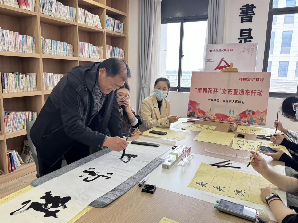 中国江苏网10月17日连云港讯 近日,由海州区锦屏镇新时代文明实践所主办的“茉莉花开”文艺直通车行动,满载着翰墨书香,驶入镇小镇书房,为居民献上了一场别开生面的书法艺术盛宴。活动现场墨香四溢,浓郁的传统文化氛围与群众高涨的热情相互交织,共同勾勒出一幅雅俗共赏、其乐融融的生动画面,标志着直通车行动在丰富群众精神文化生活方面又迈出了坚实一步。