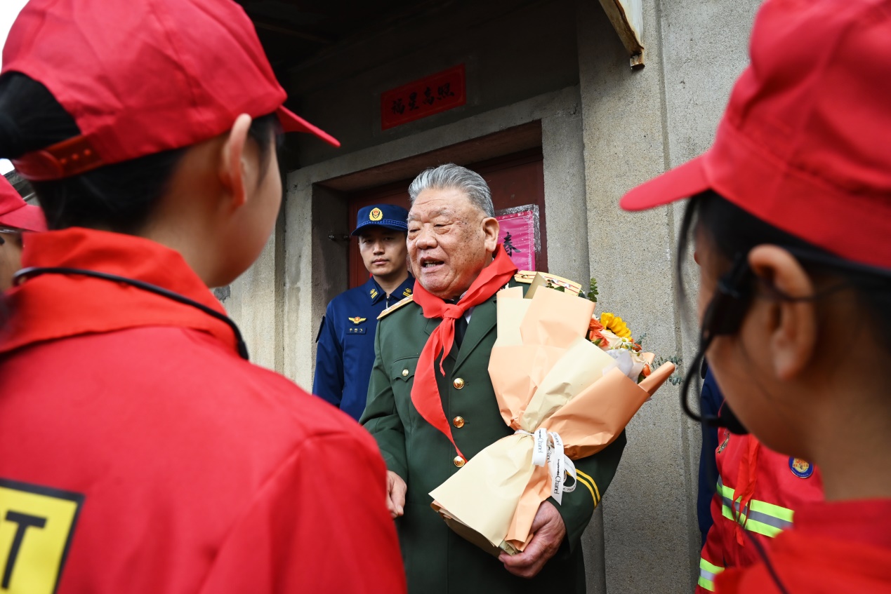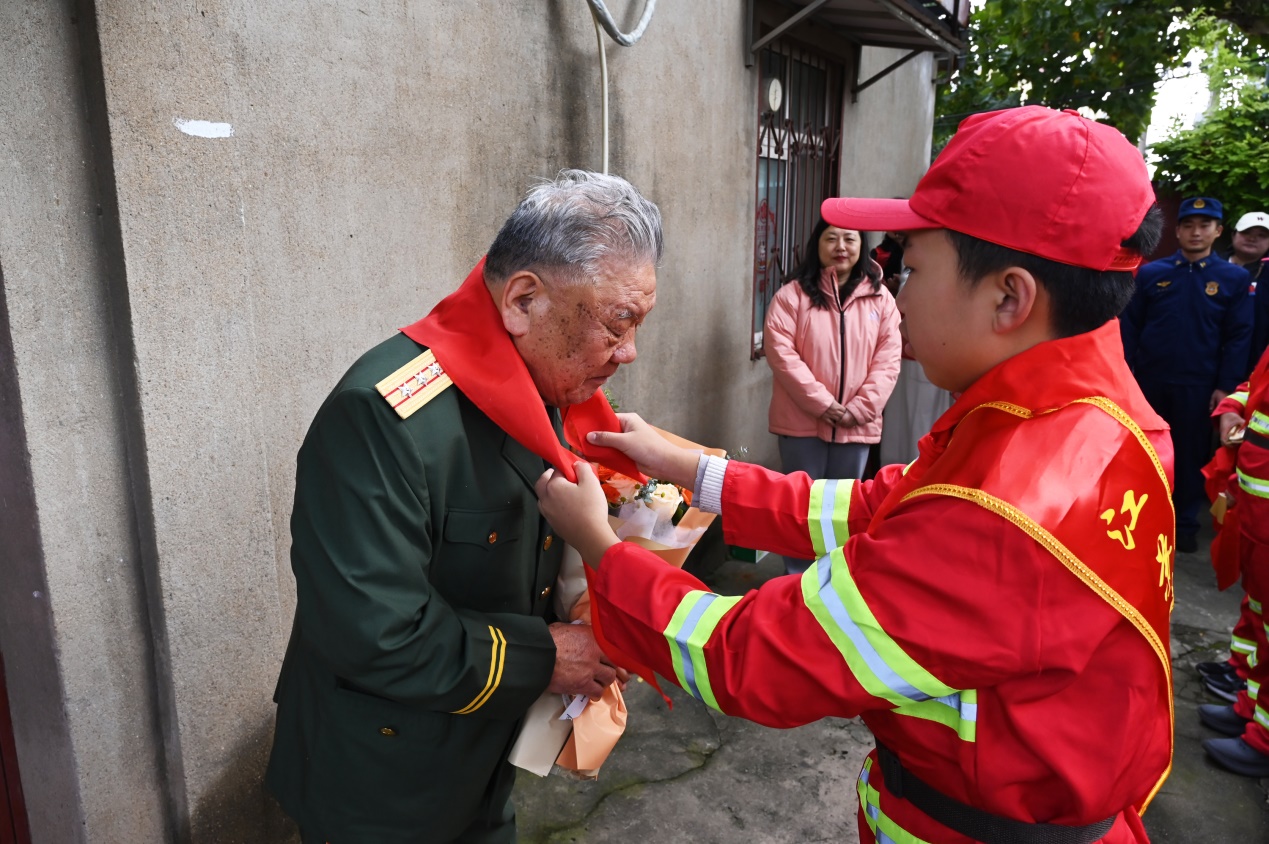“看到孩子们来,还表演了这么好的节目,我心里特别暖和。”孙堂爷爷的眼中满是欣慰,“这根‘小竹竿’的故事让我想起了很多过去的事,消防为民的精神,在今天这些孩子身上看到了传承。”表演结束后,孩子们庄重地向孙堂爷爷敬献鲜花与红领巾,鲜红的领巾在老人胸前飘扬,不仅是一份崇高的敬意,更象征着消防责任与担当的代代接力。