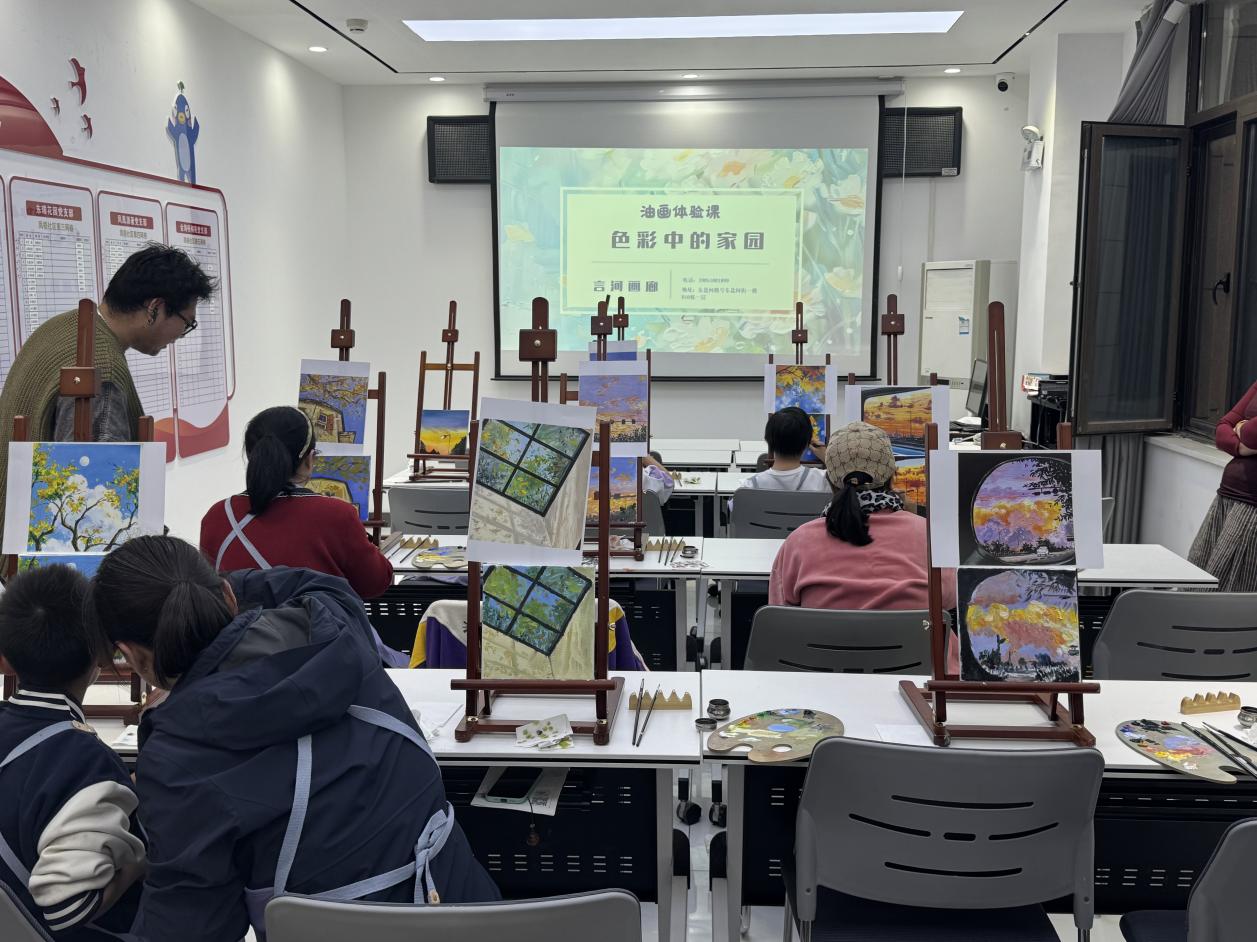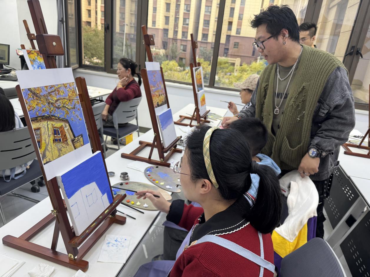 活动伊始,来自言河画廊的专业老师结合秋冬季节的色彩特点,从基础的色彩搭配原理讲起,细致演示笔触运用技巧,并针对构图设计给出实用建议。“大家可以试着用暖黄色调表现秋日阳光,蓝色与白色调和能呈现冬日初雪的朦胧感。”老师一边讲解,一边手把手指导大家调色、下笔,耐心解答大家提出的疑问。