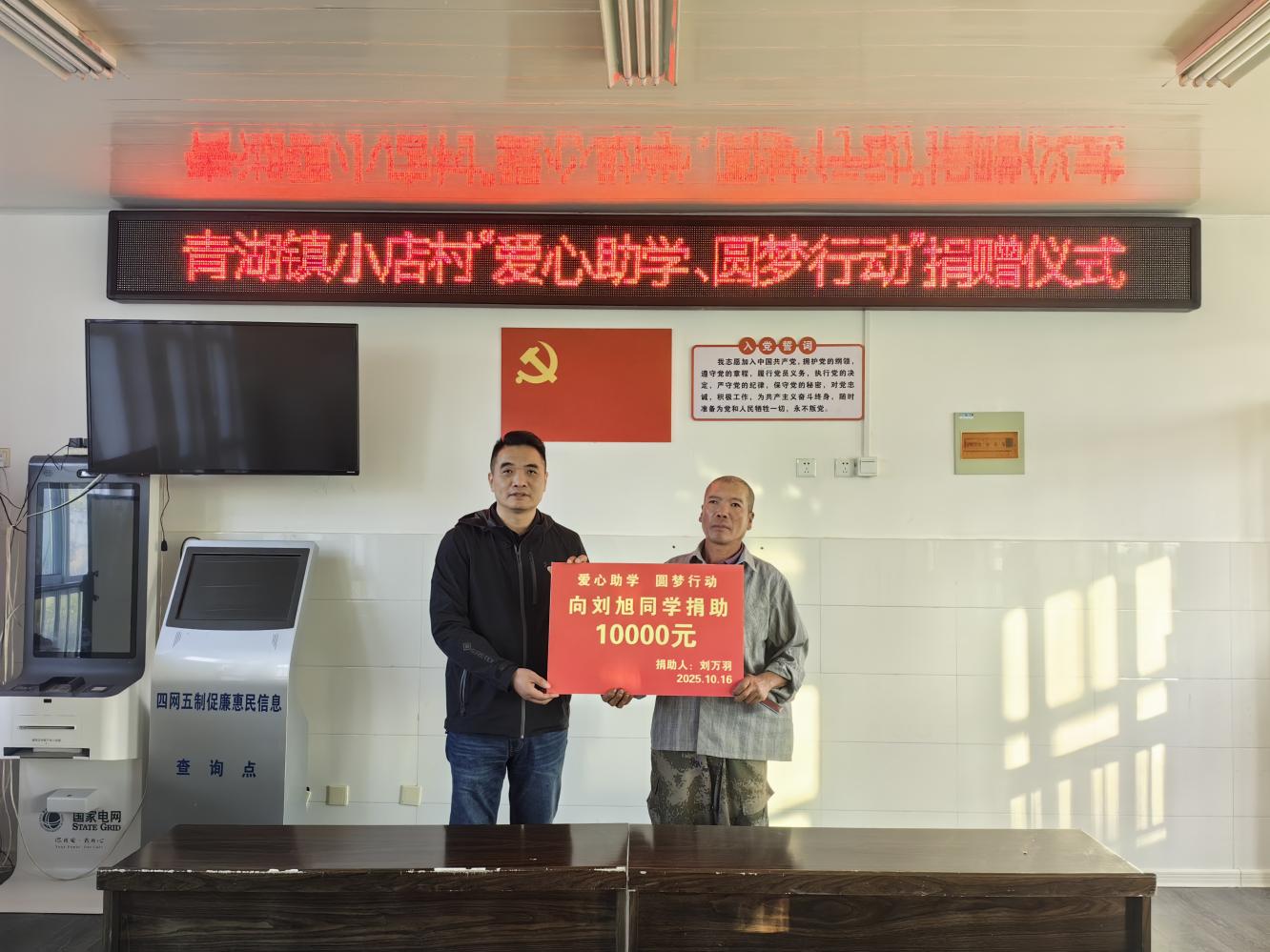 吃水不忘挖井人。回想起自己在上学的时候,也曾受到过来自党委政府和社会各方面的资助和帮扶,刘万羽心怀感激,知恩图报,心中萌生了回报社会、反哺乡邻的善念,决定在自己能力范围内出资帮助村里贫困家庭的大学生,将爱心和温暖传递下去。于是,刘万羽便和小店村党支部书记刘斌取得联系,委托村里替自己挑选两户家里有孩子正在上大学的贫困家庭,每户每年资助10000元,直至孩子大学毕业。经过村干部的认真摸排,村里最终确定两户低保家庭的贫困大学生作为资助对象,并将贫困家庭相关情况告知刘万羽。随后,刘万羽将20000元资金转到村里的财务账户,并委托村干部代为发放,于是便有了文章开头的暖心一幕。
