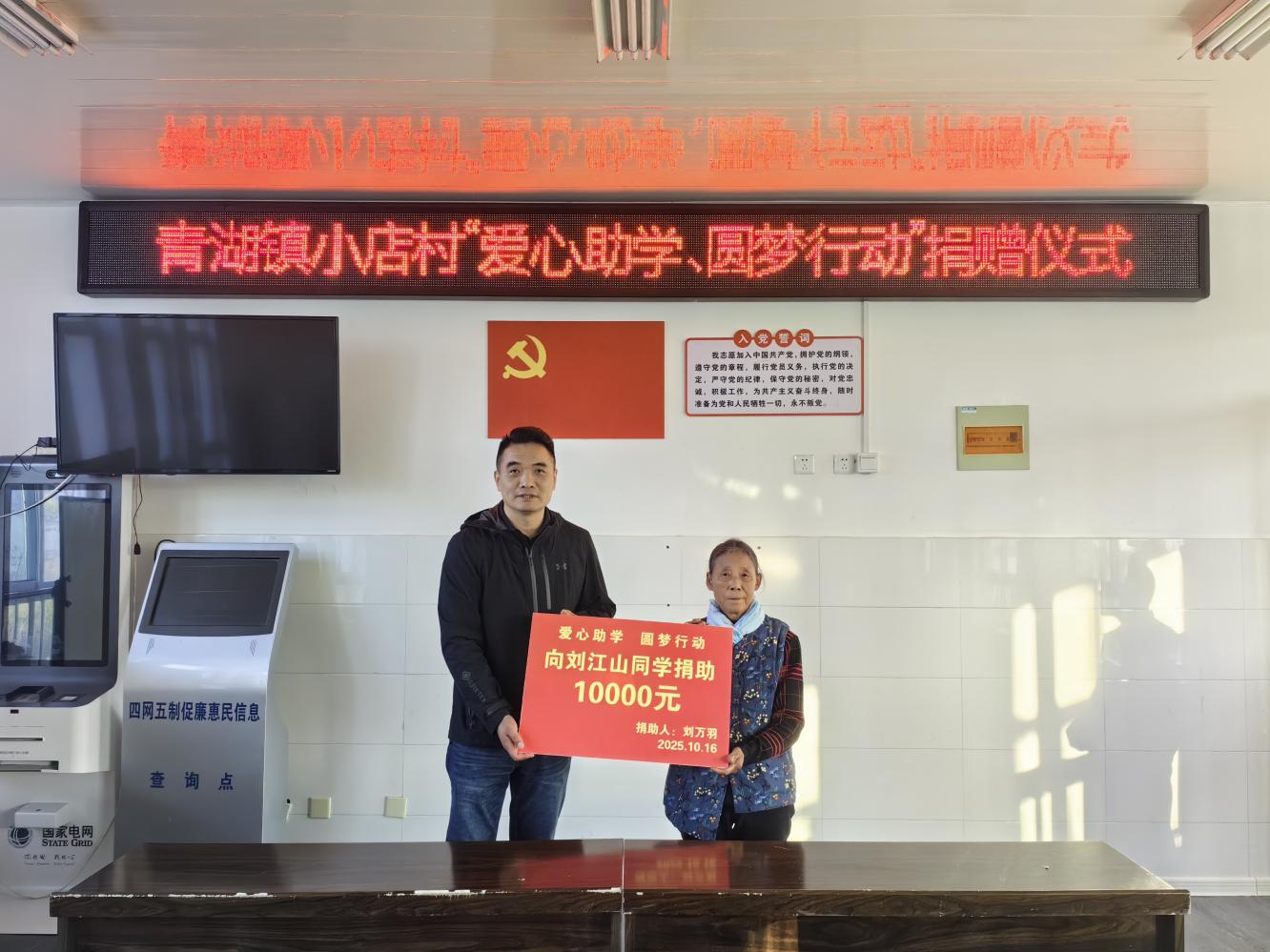 中国江苏网讯 “俺们从心底里非常感谢村里的好心人,为家里上大学的孩子捐助资金,一定会告诉孩子在学校里要好好学习,用优异的成绩回报好心人。”日前,在东海县青湖镇小店村的党员活动室里,举行了一场“爱心助学、圆梦行动”捐赠仪式,受捐助人委托,村党支部书记刘斌向村里的两户贫困家庭分别发放了10000元爱心助学资金。