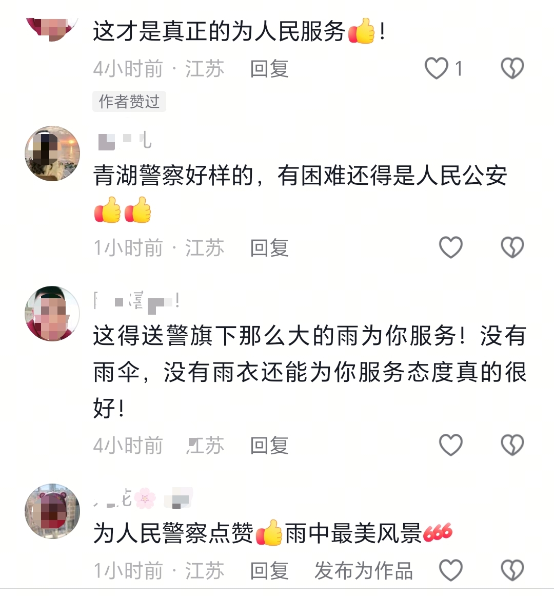 视频在网络上发布后,迅速引发关注。网友们一致为民警的尽职尽责和热心群众的善举点赞留言:“风雨无情,人间有爱!”“看到民警浑身湿透的样子,既心疼又感动!”“为东海民警和热心群众点赞,你们是雨夜中最暖的光!”(袁青青 时畅畅)