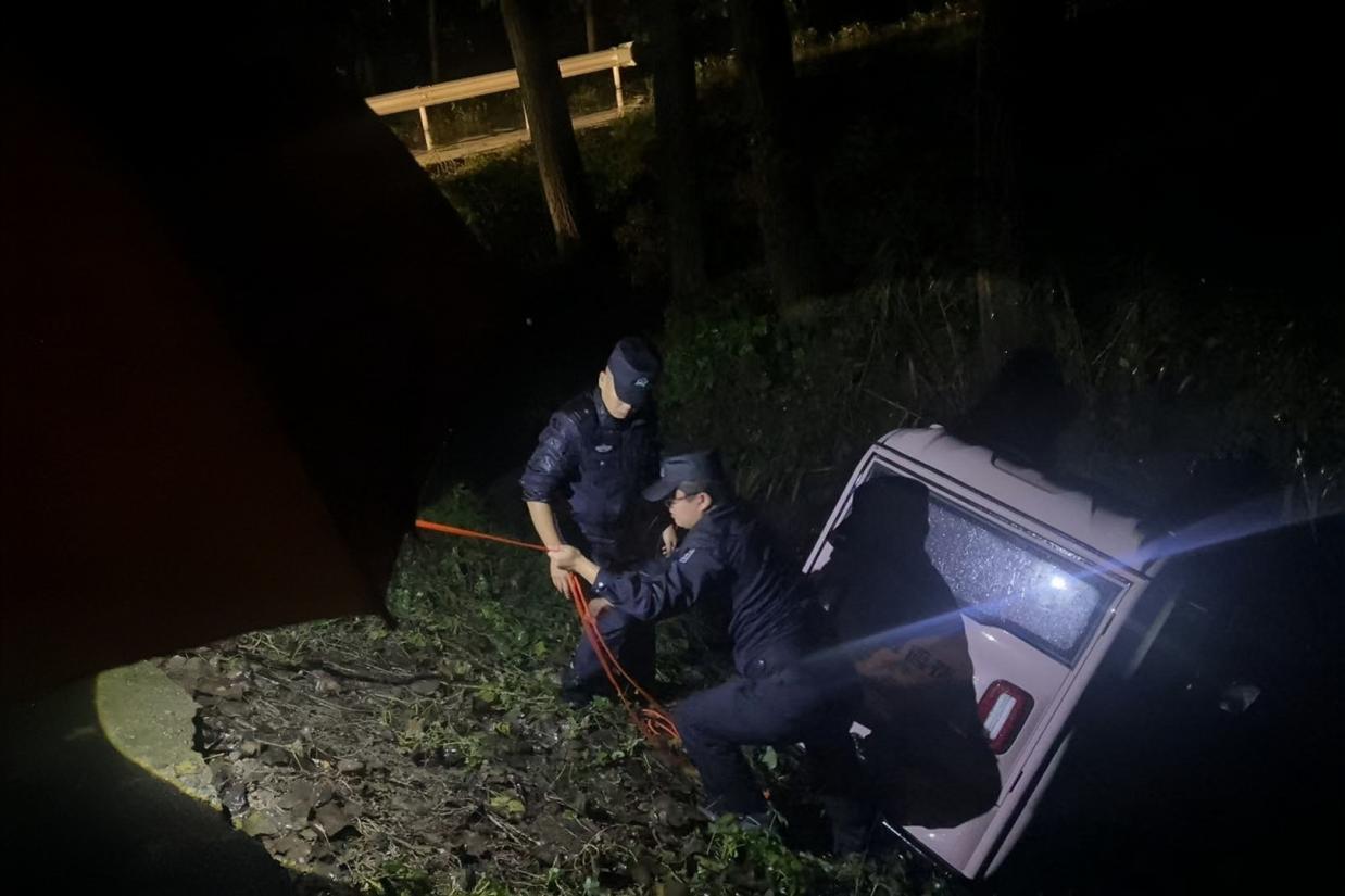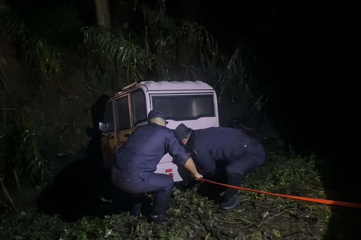 警情就是命令。接到求助后,派出所民警辅警立即驱车赶赴现场。到达后,他们发现老人已在先期到达的热心群众的帮助下,安全地从车内出来,身体并无大碍。然而,老人的三轮车却深陷沟底,由于泥土湿滑、沟渠较深,现场人员多次尝试都无法将其推出。