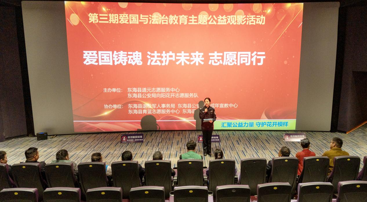 中国江苏网10月29日连云港讯 为弘扬爱国主义精神,深化法治宣传教育,凝聚志愿服务力量,日前,东海县公安局向阳花开志愿服务队联合东海县道元志愿服务中心、青蓝志愿服务中心、县朗诵协会等社团组织,开展以“爱国铸魂·法护未来·志愿同行”为主题的公益观影活动,吸引了社区居民代表、未成年人及家长代表、退役军人代表、学生代表等各界人士积极参与。