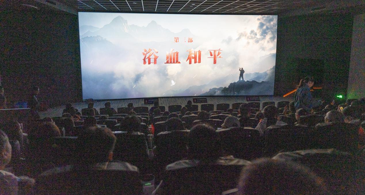 最后,全体参与者共同观看了电影《志愿军》。影片深刻再现的历史场景让大家深受震撼。观影结束后,在主持人的引导下,全场起立,齐声高唱爱国歌曲《大中国》,用激昂的歌声将现场涌动的爱国情感推向顶点。