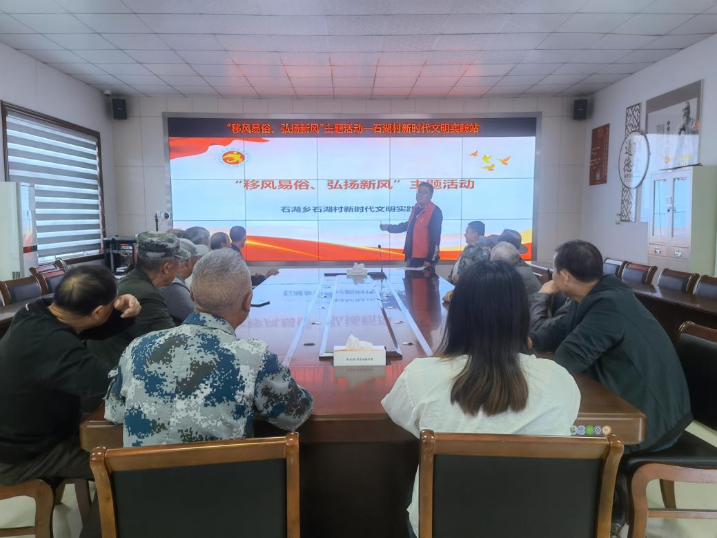 作为“茉莉花开”文艺直通车活动的重要站点,石湖乡借力这一文化惠民平台,将移风易俗宣传与文化活动深度融合,让文明之花遍开乡村。每到开展文艺演出、电影展映等活动时,乡村大舞台前早早挤满前来观看的群众,每场活动都紧扣移风易俗、乡风文明、红色教育、传统节日、防诈骗等主题,用群众喜闻乐见的艺术形式传递正能量。活动间隙,志愿者们还会向群众发放移风易俗宣传单,现场讲解村规民约。