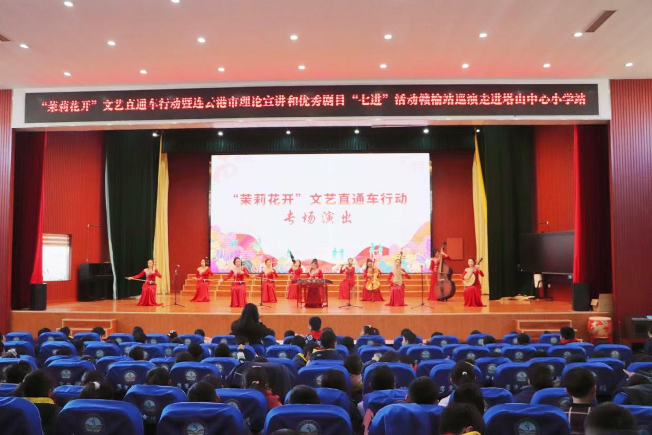 中国江苏网11月21日连云港讯 11月19日,由中共连云港市委宣传部主办,中共赣榆区委宣传部、塔山镇新时代文明实践所共同承办,江苏女子民族乐团倾情演出的“茉莉花开”文艺直通车行动暨连云港市理论宣讲和优秀剧目“七进”活动赣榆站巡演走进充满活力的塔山中心小学,为在校师生带来了一场融思想性、艺术性与教育性于一体的文化盛宴。