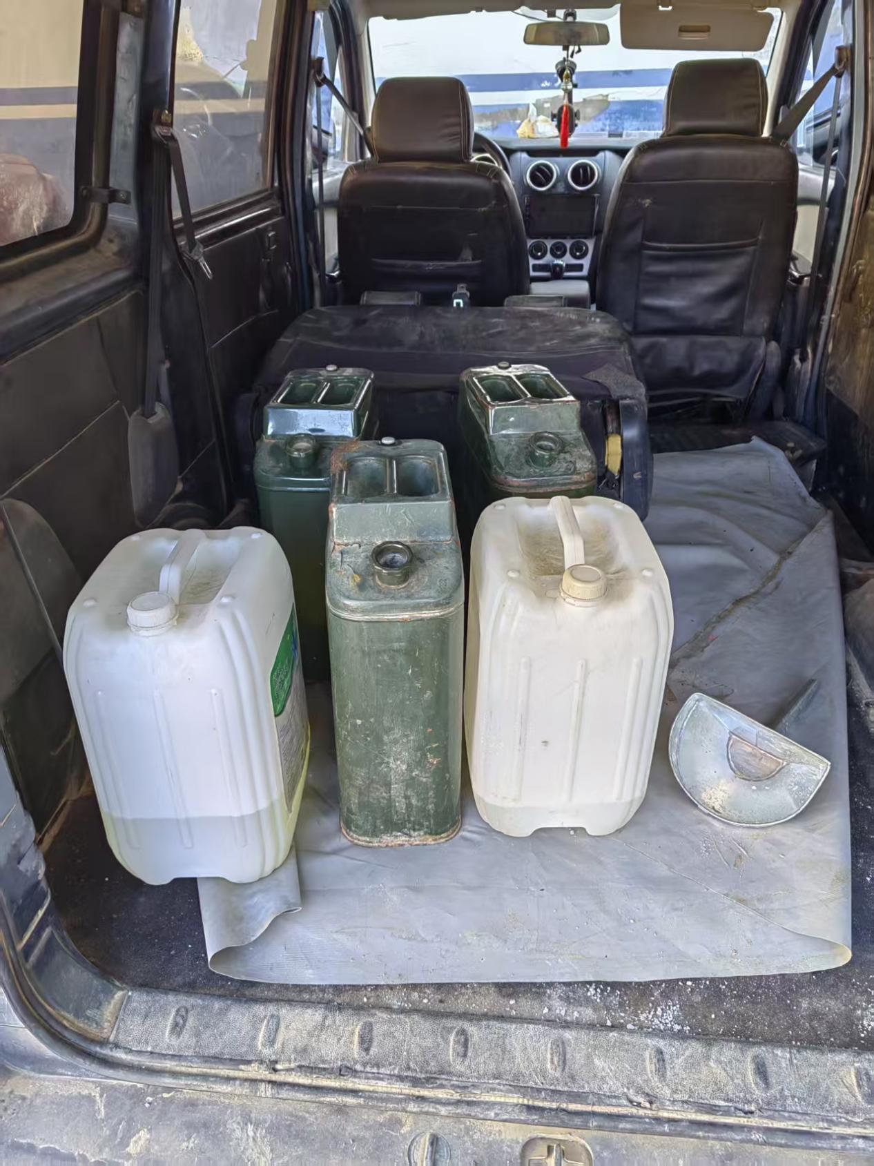 当日傍晚,民警巡查至辖区某省道路段时,发现一辆小型面包车停靠在路边偏僻处,形迹可疑。民警上前核查时,一股浓烈的汽油味扑面而来。经检查,该车后排座椅已被拆除,车厢内违规存放5个装满汽油的铁桶,未配备任何防火、防爆、防泄漏设施,安全防护措施形同虚设。