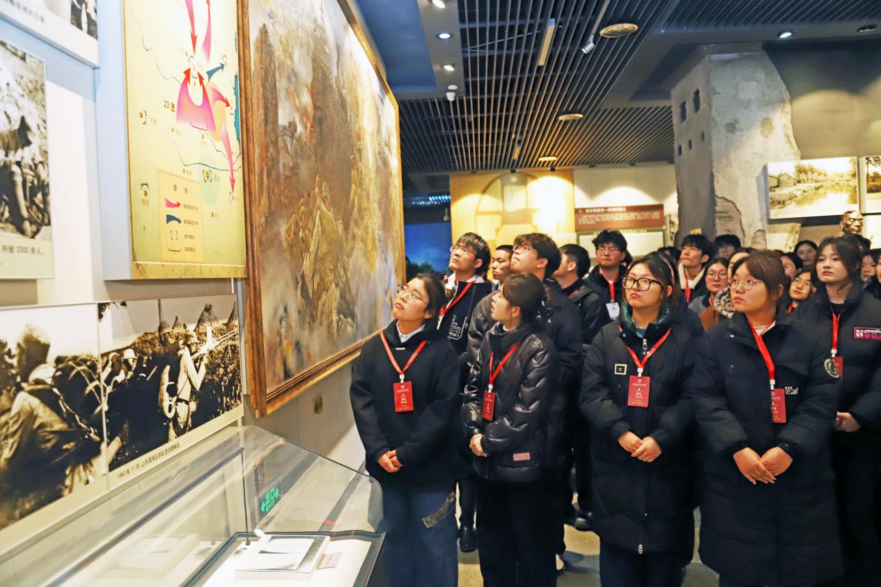 中国江苏网12月10日连云港讯 为深切缅怀革命先烈,引领广大青年学子牢记历史使命,激发挺膺担当,在纪念“一二·九”运动90周年之际,12月9日下午,连云港职业技术学院联合连云港市革命纪念馆开展“弘扬抗战精神 凝聚强国力量”主题宣讲活动。本次活动由该校7名退役大学生士兵加入的新时代“小推车”志愿讲解团队依次在连云港市革命纪念馆开展宣讲,市革命纪念馆副馆长姜龙、宣教部副主任房阳,连云港职业技术学院团委书记孙明珠及团委全体工作人员、50余名“青马学员”代表参加本次活动。