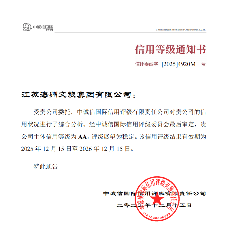 中国江苏网12月18日连云港讯 近日,海州文旅集团有限公司经权威信用评级机构中诚信国际信用评级有限公司综合评定,正式斩获AA主体信用评级,评级展望为稳定,有效期自2025年12月15日至2026年12月15日。