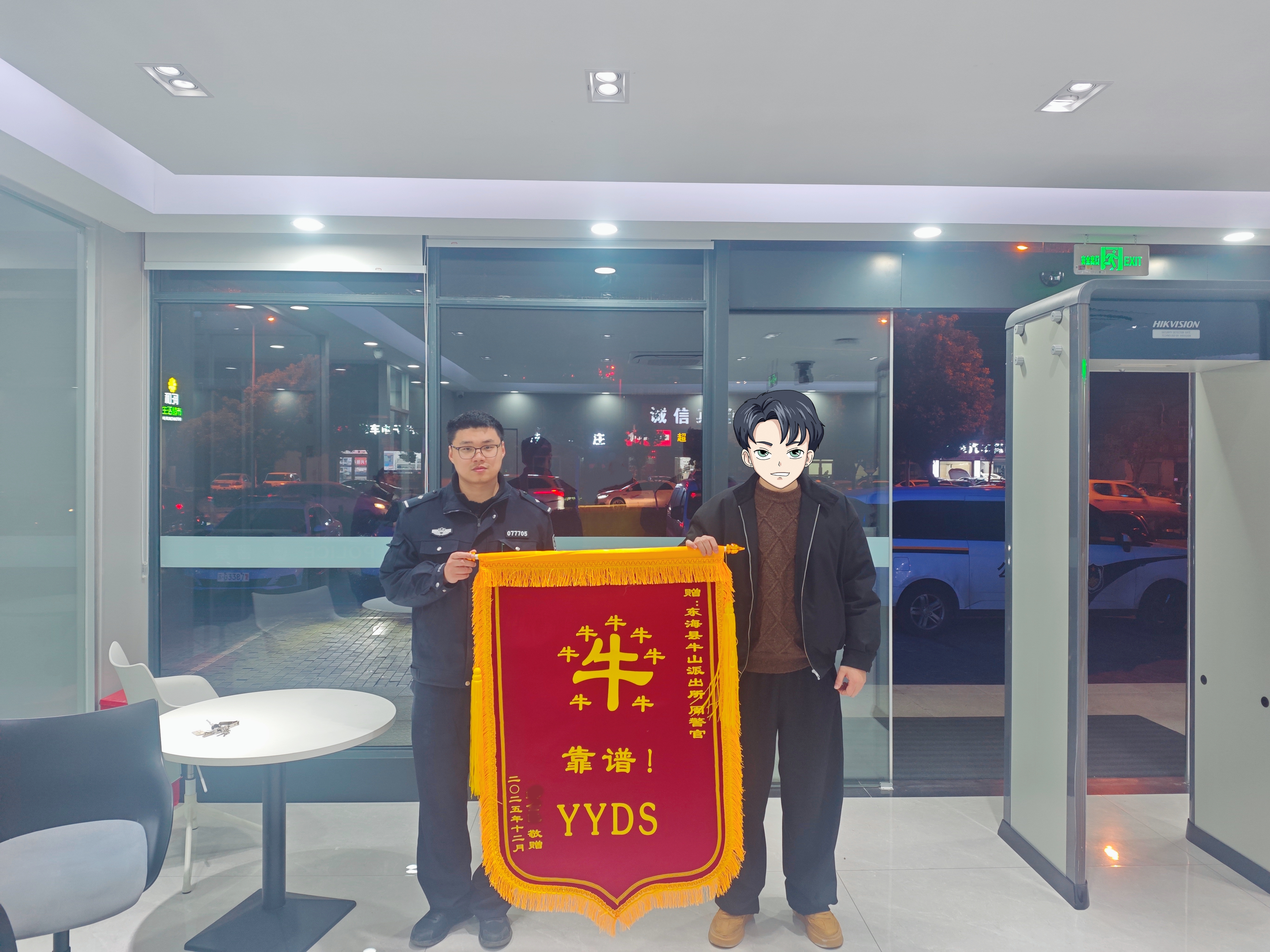 从报警到货款追回,整个过程仅用了一小时。该黄金店店主魏先生对民警的高效工作和认真负责的态度感动不已。为表达谢意,他特意定制了一面写有八个“牛”字的锦旗,专程送到牛山派出所。“牛!牛!牛!……”锦旗上的八个“牛”字,既是群众对民警工作能力的认可,也寄托了对人民警察守护平安、服务群众的真挚谢意。(袁青青 李鑫鑫)