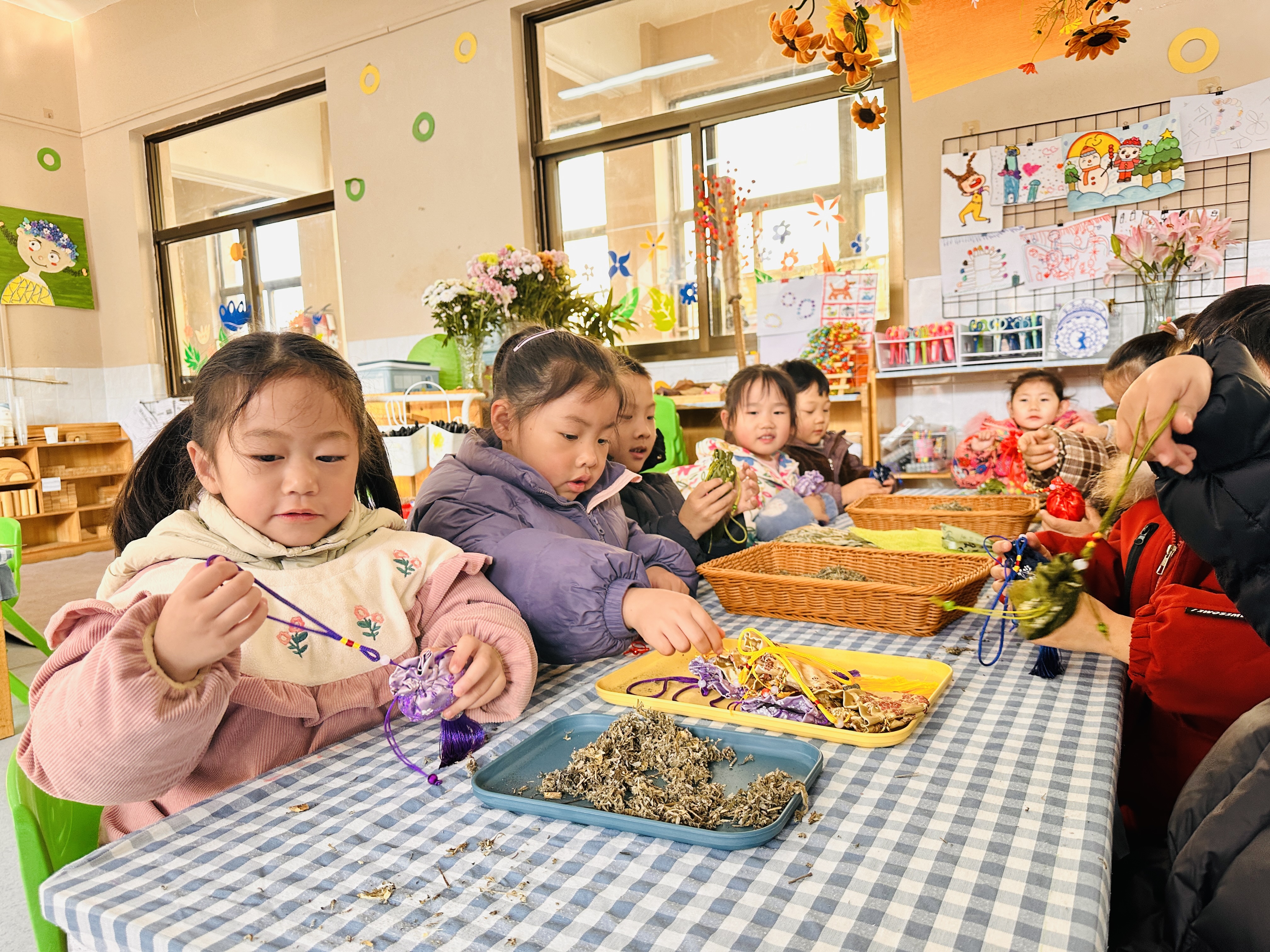 中二班专注于巧手编织制作,一个个内含草本植物的“中药养生锤”在孩子们手中诞生,在轻轻敲打间体验传统物理舒缓的妙处;大二班的探究则更具生活气息,孩子们不仅学习泡制驱寒暖身的“三宝茶”,还动手尝试腌制萝卜等食物,在实践中领悟中医的养生之道与古人食物腌制保存的古法智慧。