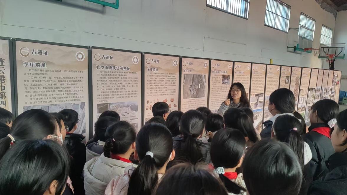展览现场,来自连云港市文物保护和考古研究所的专业讲解员担任“历史引路人”,结合展板内容,为学生生动讲解文物背后的历史故事。从李庄遗址的战国盐灶结构,到新洪遗址的发掘过程,再到汤曙红烈士的英雄事迹,讲解员通过形象的语言,使历史知识变得可观可感,真正实现了“触摸历史印记”的教育效果。