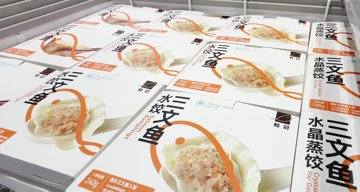 项目构建了从前端到后端的完整链条式保障体系。在苗种供给端,项目团队在国内四省布局标苗基地,采购优质鱼苗;派驻专业人员驻场监督品控,形成成熟的盐化技术标准,严控鱼苗品质。在生产保障端,具有三文鱼养殖经验的专业人员及船务人员提前进驻工船,养殖保险、燃油供应有序落地,同时与多家行业头部饲料供应商推进合作,确保后续供应稳定可靠。在市场销售端,提前布局营销链路,已打通SKP、朴朴超市等商超餐饮渠道,与天津食品集团达成战略合作,自有“鲑冠”品牌亮相多个重量级展会,同时成功研发三文鱼水饺、冰鲜刺身等15款产品,其中三文鱼水饺已启动量产。