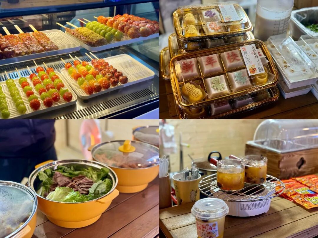 糖葫芦、芝士烤红薯、关东煮、炸鸡、煎凉粉……