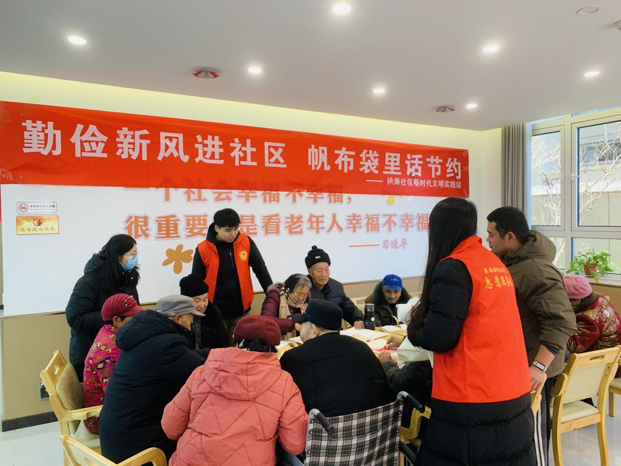 巧手传俭,一针一线绣新风。新年将至,徐海社区在辖区养老院开展“勤俭新风进社区,帆布袋里话节约”主题活动。居民们一边制作以马年为主题的吉祥帆布袋,一边畅聊理性采购年货、践行“光盘行动”、拒绝过度包装等节日期间具体可行的节约心得,摒弃铺张浪费陋习,以简约适度的方式喜迎新春。