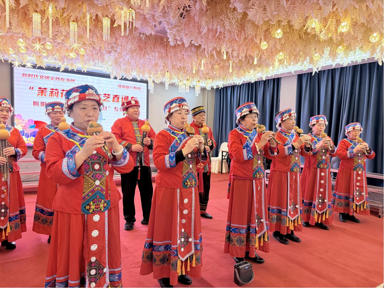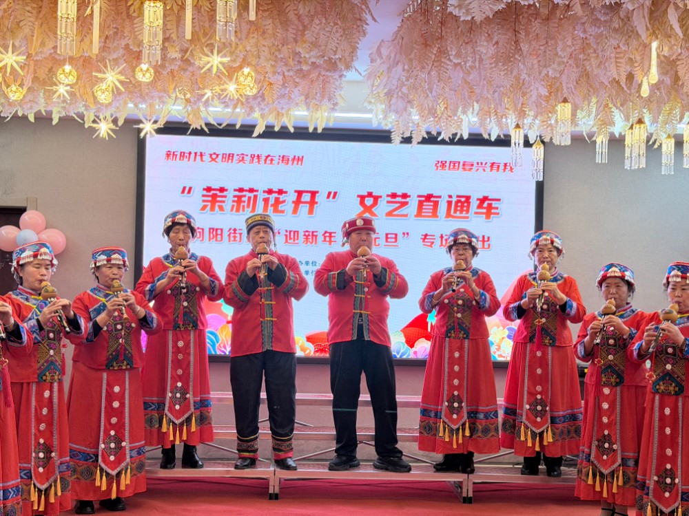 在朐海社区,“茉莉花开”文艺直通车葫芦丝元旦专场演出热闹开演。朐海社区老年艺术团的成员们,个个神采奕奕。身着一袭统一的红色民族风演出服,以精湛的葫芦丝演奏吸引了众多居民。他们精神矍铄,指尖流淌出《月光下的凤尾竹》等经典曲目,乐声时而婉转悠扬,时而欢快激昂。为了这场演出,老人们提前数月精心排练,反复打磨细节。从识谱到合练,从生疏到娴熟,葫芦丝不仅是一种乐器,更成了他们退休后生活里新的支点与光亮。“每天都要练上两小时,手指头都磨出茧子了,但心里高兴!”团长朱家华笑着说,“音乐一响,什么烦恼都没了,感觉自己还年轻着呢!”舞台上,他们专注投入的表演,不仅传递了对新年的美好祝福,更展现了新时代老年人健康乐观、积极向上的精神风貌和艺术追求。