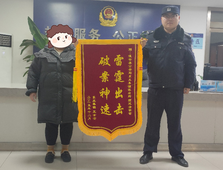 中国江苏网1月7日连云港讯 近日,辖区居民王女士来到灌云县公安局东王集派出所,将一面印有“雷霆出击,破案神速”的锦旗送到民警的手中,并连声道谢,感谢民警及时帮其找回被盗的50多克黄金首饰。而在这个案件的背后,还有着一段令人啼笑皆非的“故事”……