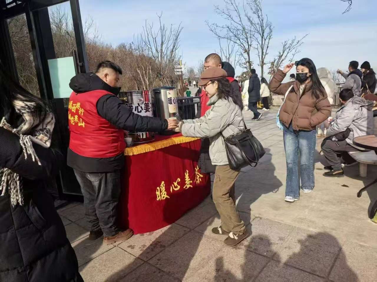 在山门广场、玉女峰观景台等多个点位,景区还设立了暖心茶摊,免费供应滚烫的姜枣茶,让游客在登山之余驱寒暖身。来自上海的游客李女士手捧热茶连连称赞:“喝上一口,从喉咙暖到胃里,花果山不仅景美,服务更贴心!”带着孩子登山的张先生笑道:“孩子一直说茶煮得真甜。本来担心山路冷,没想到景区考虑得这么周到。”