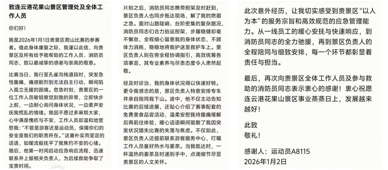 信中写道:“比赛当日,我行至孔雀沟栈道段时突发急性腹痛,情况危急。景区工作人员立即上前询问安抚,并迅速启动应急响应,随后消防员同志携带担架及时赶到,在山路陡峭、台阶密集的情况下,稳稳将我护送至救护车上。景区负责人也全程协调陪同,安排专车送我下山,并提前备好热水与姜茶。”“从一线员工的暖心安抚,到消防员的全力驰援,再到负责人的细致安排,每一个环节都让我深刻感受到景区‘以人为本’的服务宗旨与高效的应急管理能力。”这位参赛者在康复后,专门通过感谢信表达了对全体工作人员与消防员的诚挚谢意,也为花果山景区的人性化服务与专业精神点赞。