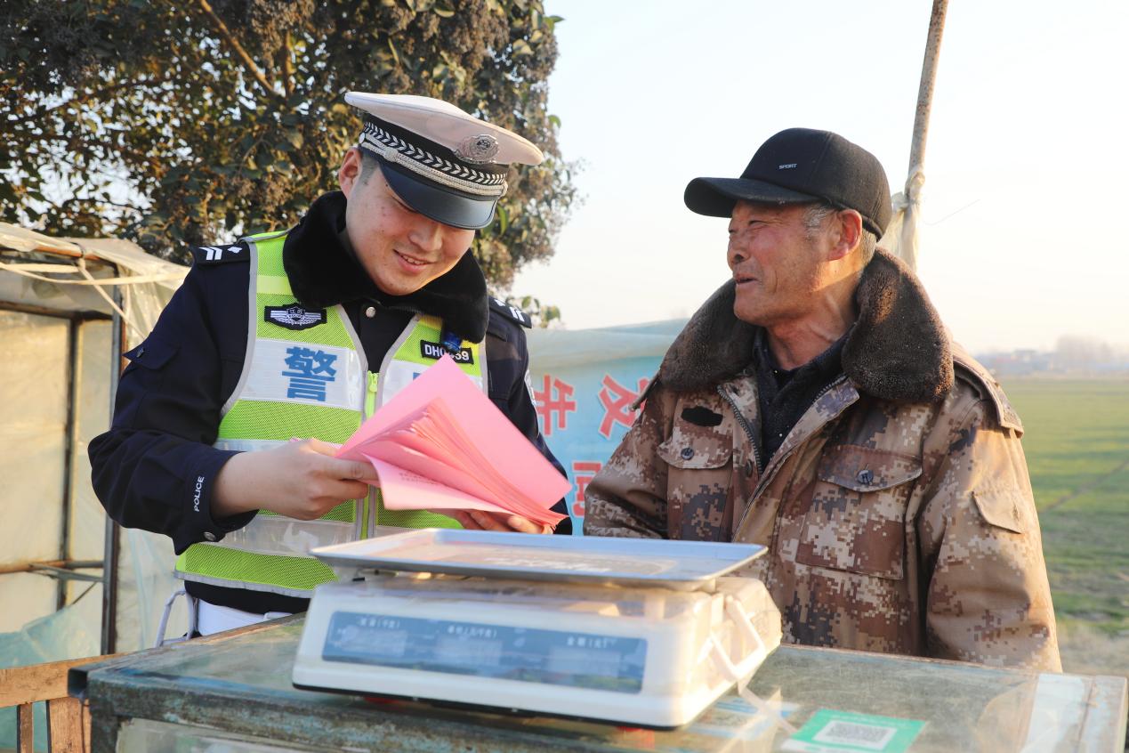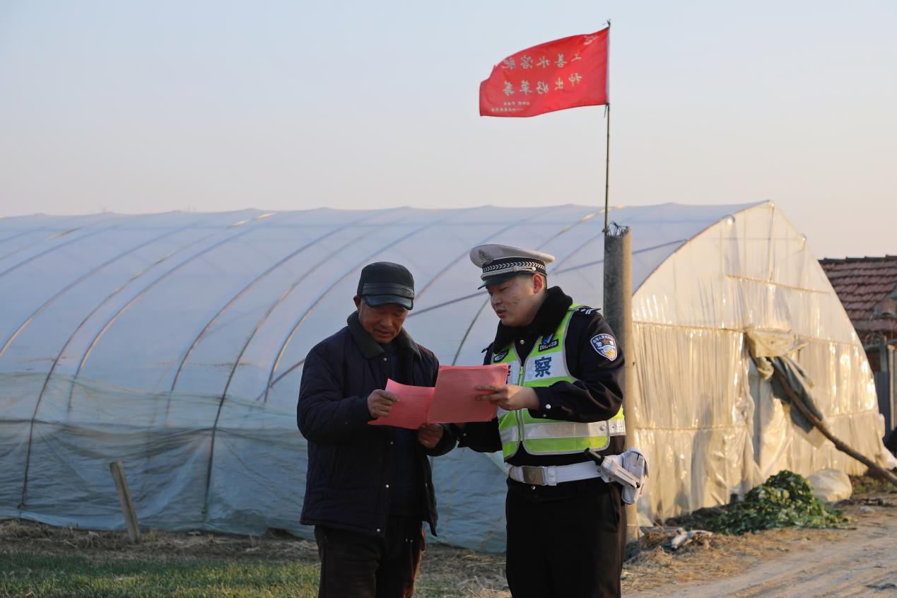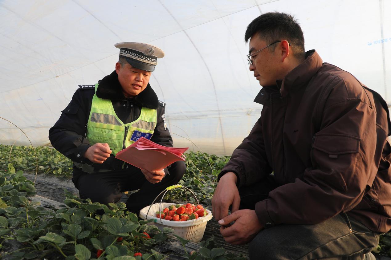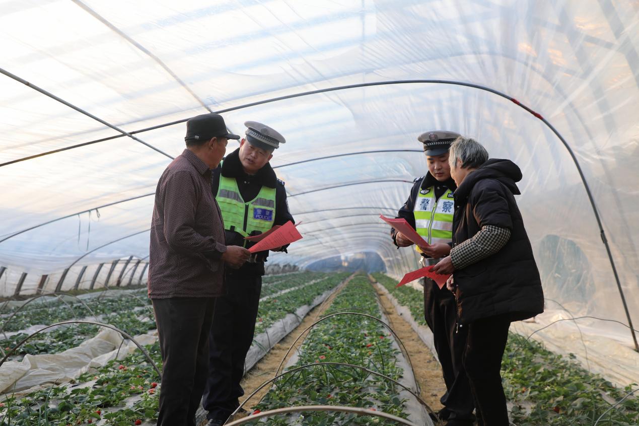 随后,民警辅警来到黄川镇陈墩村草莓大棚集中区域。此时正值田间管理期,不少农户正在大棚内辛勤劳作。交警走进大棚,向农户们发放交通安全宣传资料,并结合草莓成熟季即将来临,农户们运输草莓、摆摊销售活动频繁的情况,进行了有针对性的安全提醒。民警辅警提醒农户,在驾驶车辆运输草莓时,务必确保车辆安全状况良好,严禁超载、人货混装;在前往市场或路边摆摊销售时,要选择安全合规的地点,切勿在国省道、县乡道路主干道上随意占道经营,避免因停车不当引发交通拥堵或事故。