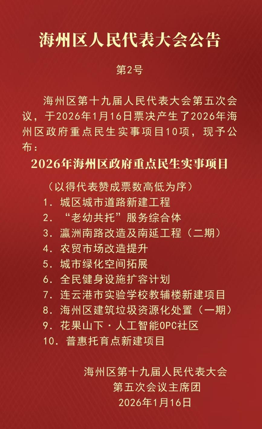 中国江苏网1月20日连云港讯 1月16日上午,海州区第十九届人民代表大会第五次会议圆满完成各项议程,举行闭幕会。会议现场正式宣布了海州区2026年政府重点民生实事项目票决结果,一批聚焦群众急难愁盼的民生项目顺利敲定,为新一年民生保障工作划定清晰蓝图。