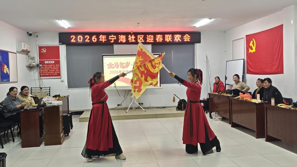 激昂的鼓点音乐骤然响起,何进芳和徐传玲手持红黄交织的龙纹旗缓缓登场。她们配合默契,随着《中国龙》的节奏轻盈翻转腾挪手中旗帜,瞬间点燃了现场气氛。台下居民纷纷拍手叫好,这股昂扬的精气神,让大家提前感受到了丙午马年的蓬勃朝气。这不仅是居民们自编自演的精彩呈现,更是“茉莉花开”文艺直通车行动扎根新时代文明实践阵地,激发基层文化活力、挖掘本土文化资源的成果体现。在新时代文明实践的引领下,社区居民积极参与文化创作,让传统与现代在舞台上碰撞出绚丽的火花。