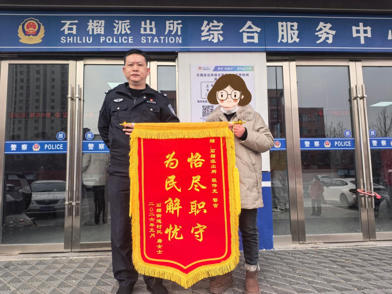 当日上午,家住石榴街道的唐女士专程来到派出所,将一面印有“恪尽职守 为民解忧”金色大字的锦旗,郑重交到户籍民警程伟光手中,感谢他为其女儿解决了困扰多年的户口难题。