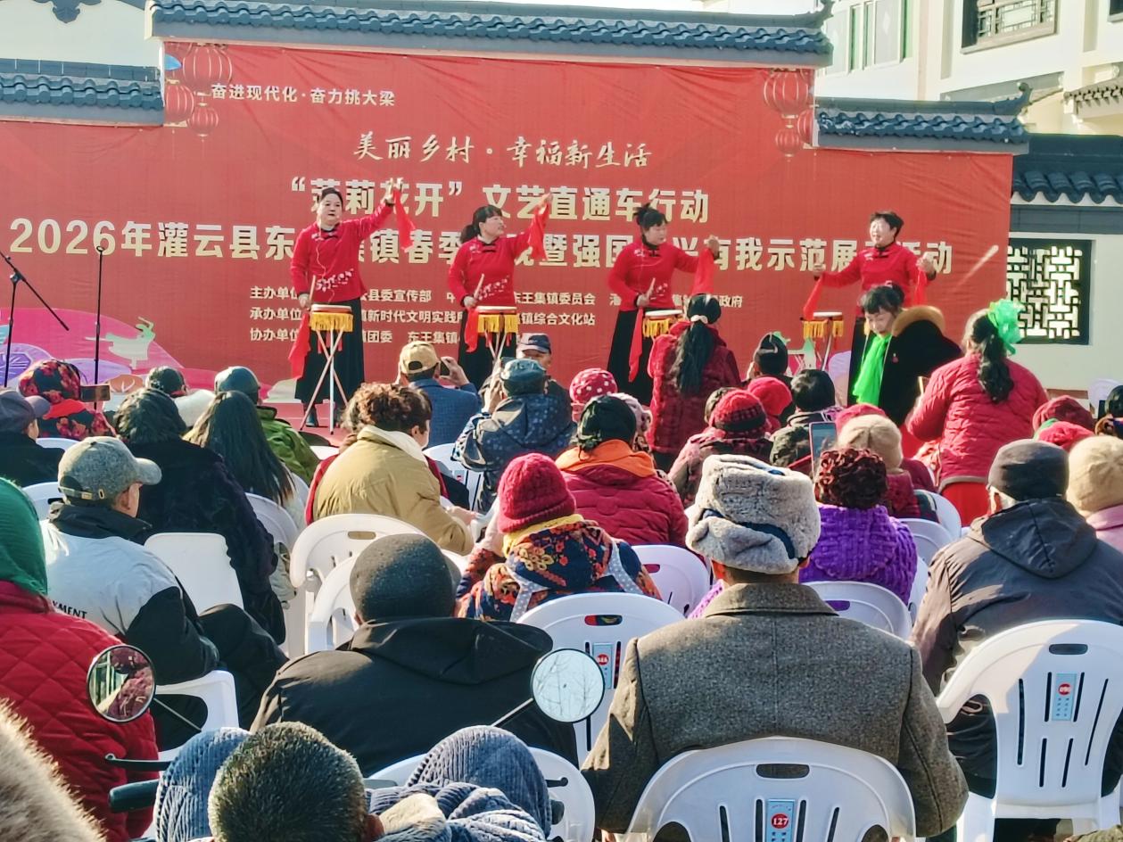 中国江苏网1月28日连云港讯 春节的脚步日益临近,年的气息在乡村弥漫。1月27日下午,灌云县东王集镇小垛村文化广场上暖意融融,“茉莉花开文艺直通车‘村晚’暨强国复兴有我”文艺演出活动在浓浓的年味中火热开场。这场完全由本村群众自导自演的“村晚”,不仅是一场文艺演出,更是一份献给全体村民的新春文化贺礼,奏响了马年春节的欢快序曲。