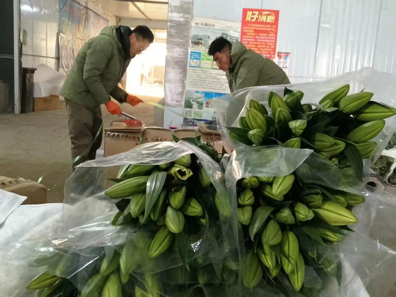 “春节到,百合俏。马上到春节了,百合花迎来了备货的高峰,花农们不误农时半夜两三点就下地采花,这会儿刚把最后一批花苞拉回来。”苗运斌介绍说。只见一朵朵包裹着塑料膜的百合挨挨挤挤,西伯利亚、索邦等几十个市场上的抢手货应有尽有。