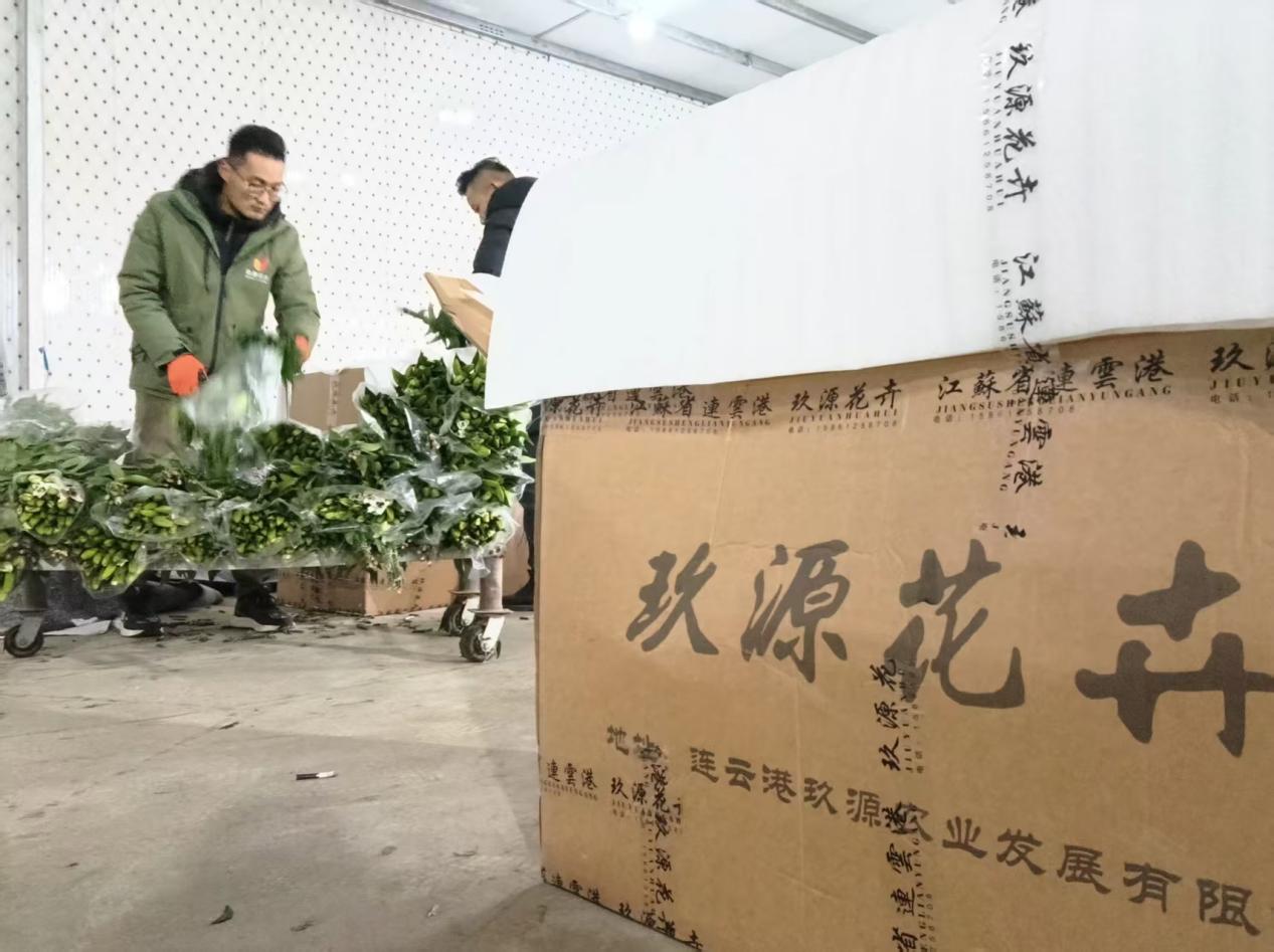 中国江苏网1月28日连云港讯 清晨6点钟,薄雾还未散尽,东海县双店镇鲜切花种植基地的寒意里已飘来清甜的百合香。在2024年全新投用的双店镇鲜花交易市场,走进鲜切花种植大户、连云港花韵通农业发展有限公司负责人苗运斌的分拣包装车间,只见百合花精致包装,整齐排列,花香四溢,伴随着春节临近,一年中最为关键的百合产销“黄金档”,正伴随着渐浓的年味全面展开。
