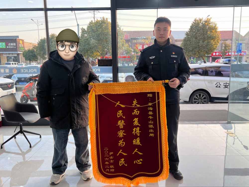 中国江苏网2月3日连云港讯 2月2日下午,东海县公安局牛山派出所收到辖区居民尹女士家人专程送来的一面锦旗,锦旗上“人民警察为人民 失而复得暖人心”的金色大字,为一起因“乌龙”引发的电动车失窃事件画上了温情的句号。