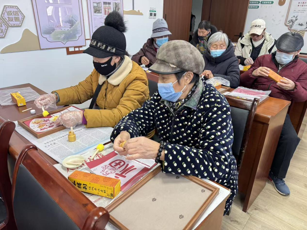 随后进入本场活动的高潮环节——台历DIY制作,居民们在讲师和志愿者的指导下,将刚刚学到的拓印技法运用到台历底板的创作中。大家小心翼翼地涂抹墨色、覆盖纸张、轻压拓印,每一个动作都饱含专注与喜悦。除了传统纹样,不少居民还发挥创意,将寓意吉祥的“福”“春”“喜”等字样与生肖元素融入设计,制作出独具个人风格的台历。现场欢声笑语不断,邻里之间互相交流技巧、分享创意,氛围十分融洽。